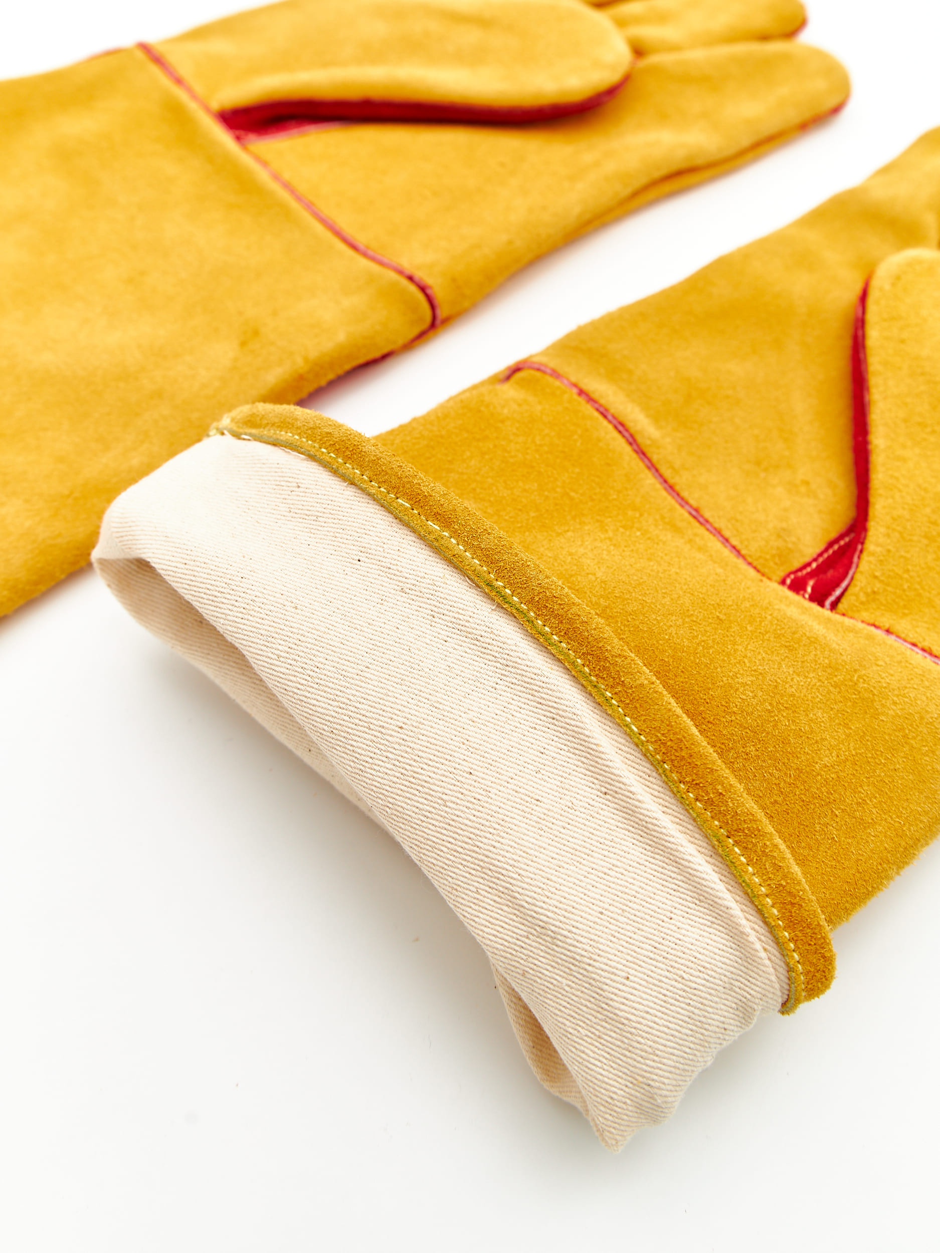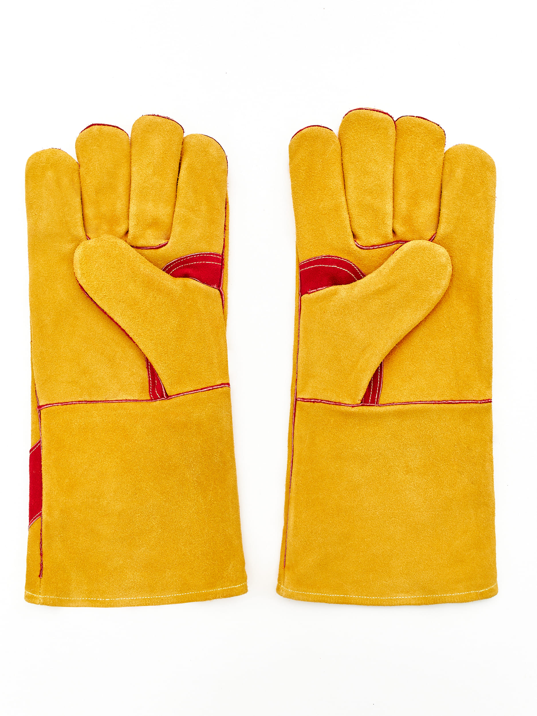 Особопрочные перчатки сварщика (краги) для защиты от механических воздействий и повышенных температур из цельного спилка, пятипалые, с флисовой подкладкой, длиной 350 мм (+/-10мм). Спилок КРС специально отобранный спинная часть шкур, прошедших предварительный отбор, спилок однородный, сорт В (1,2+/– 0,2 мм), шлифованный, желтого (золотого) цвета. Швы — оригинальная нить Кевлар, усилены вставками из кожи, на ладонной части и большом пальце дополнительный слой из спилка красного цвета. Мягкая подкладка из флиса на кистевой части. Краги сварщика обеспечивают высокую механическую защиту, защиту от повышенных температур - открытого пламени, искр и брызг расплавленного металла, высокий комфорт использования, предназначены для проведения сварочных работ.