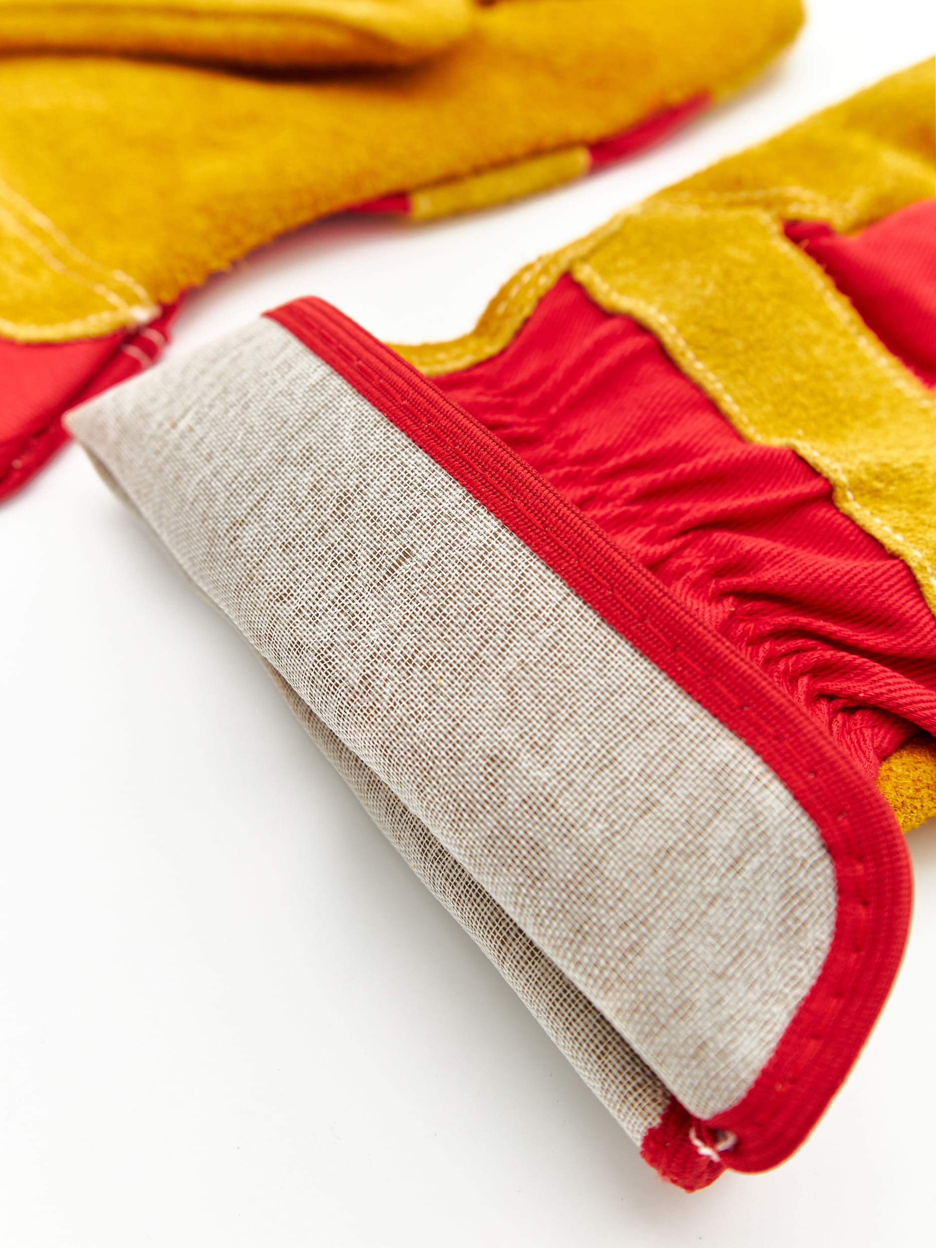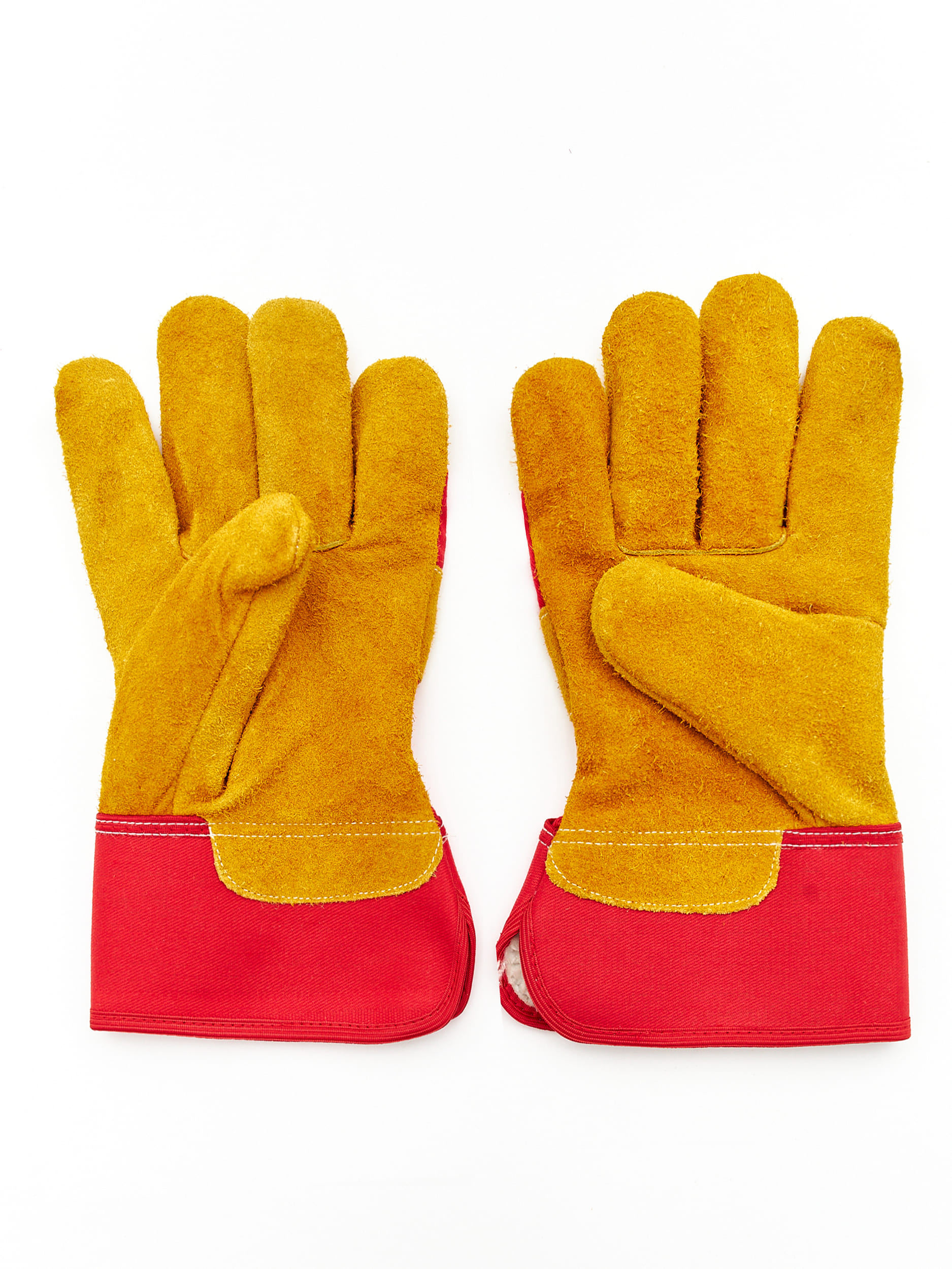 Перчатки для защиты от механических воздействий, комбинированные, плотная смесовая ткань красного цвета со спилком, защитная крага (прорезиненный жесткий защитный манжет), флисовая подкладка из хлопка на ладонной части и пальцах. Спилок КРС, сорт В (1,1-1,2 мм), шлифованный, желтого (золотого) цвета, двойные швы. Перчатки обеспечивают высокий комфорт, высокий уровень защиты от истирания и разрыва, хорошие показатели защиты от пореза и прокола. Перчатки рекомендованы для продолжительного ношения, могут быть использованы для проведения общих работ для защиты от механических воздействий в отсутствии жидких загрязнителей, таких как масло, водные растворы и тд, для защиты рук от ОПЗ.