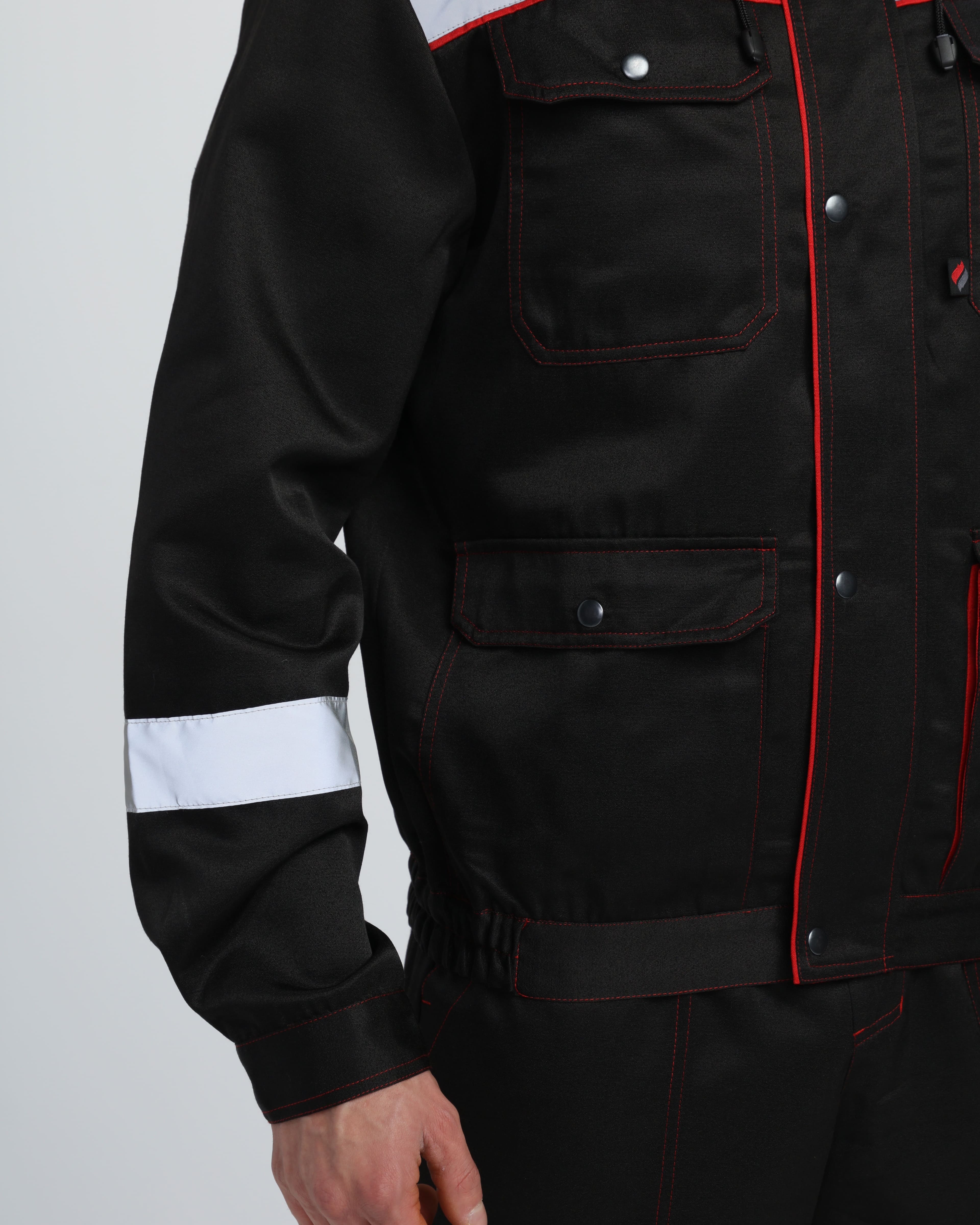 - Рукава с двухшовной конструкцией, светоотражающими полосами и манжетами на кнопке