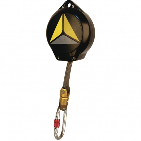 Поворотное автоматическое самовтягивающееся страховочное устройство. Инерционная тормозная система. Корпус из ABS пластика. Полиамидная лента: ширина- 25 мм, длина – 6 м. Вертлюг из алюминия с индикатором падения. В комплектацию входит 1 стальной карабин резьбовой АМ002. Испытано на 150 кг.