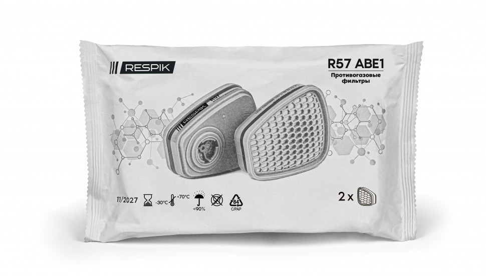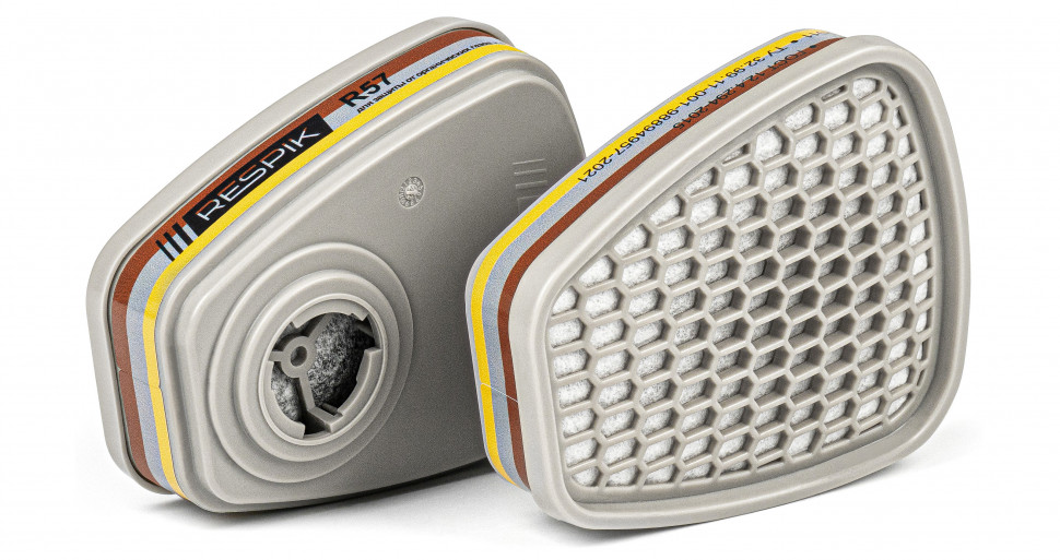 Противогазовый фильтр RESPIK® R57 предназначен для защиты органов дыхания от органических газов и паров с температурой кипения выше 65 °С, неорганических газов и паров, кислых газов, класс защиты АВЕ1.