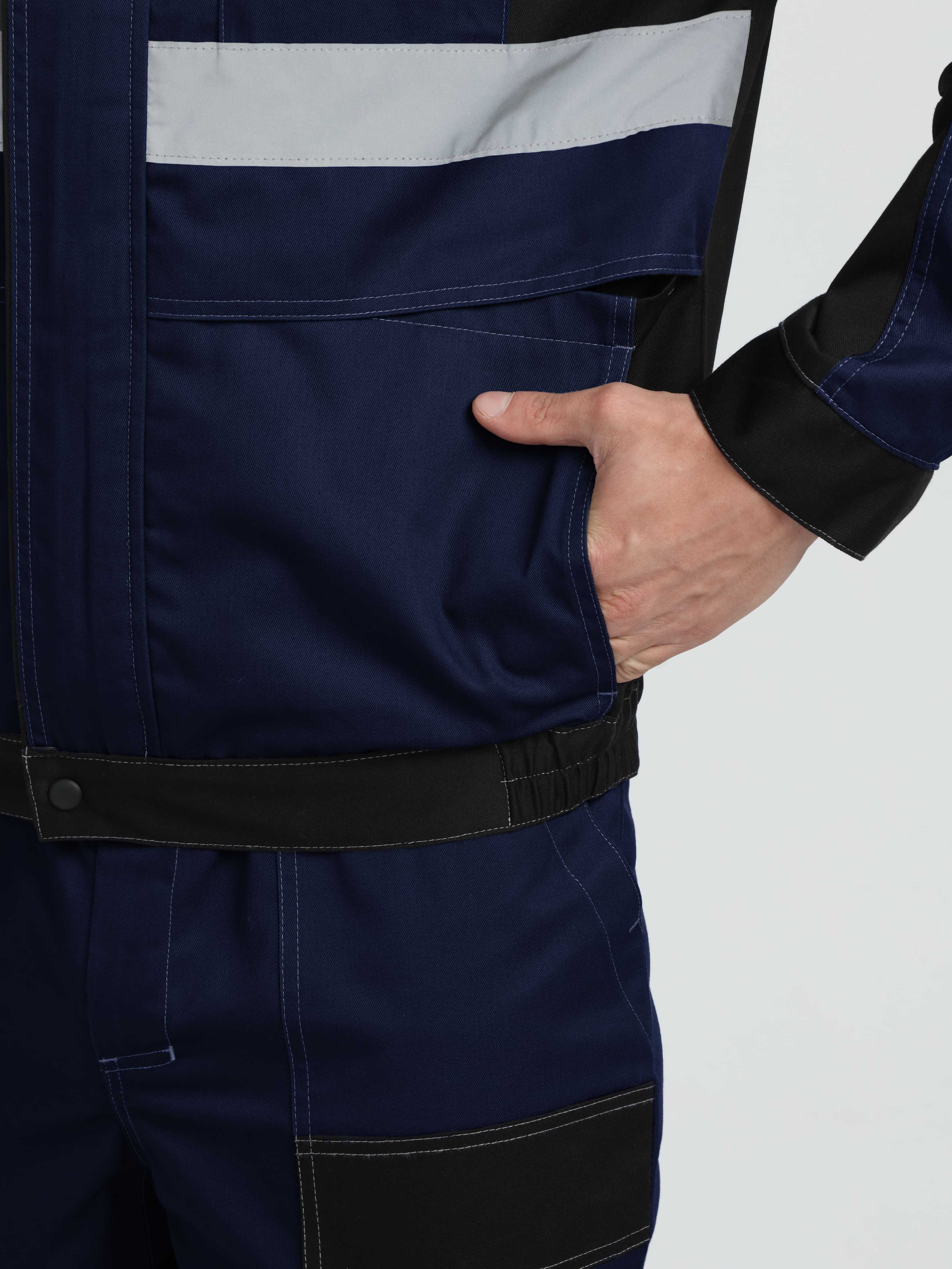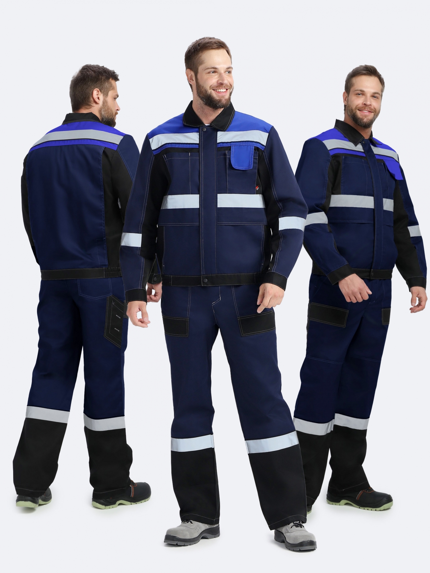 - по кокеткам, полочкам, спинке, рукавам и брючинам расположены световозвращающие полосы, что позволяет использовать костюм в условиях плохой видимости