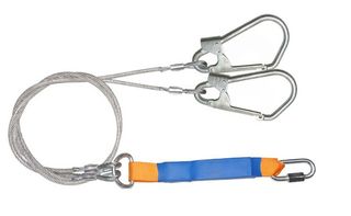Страховочный строп, двойной (двуплечий) из металлического троса в ПВХ оболочке с амортизатором, двумя большими монтажными и одним соединительным карабином