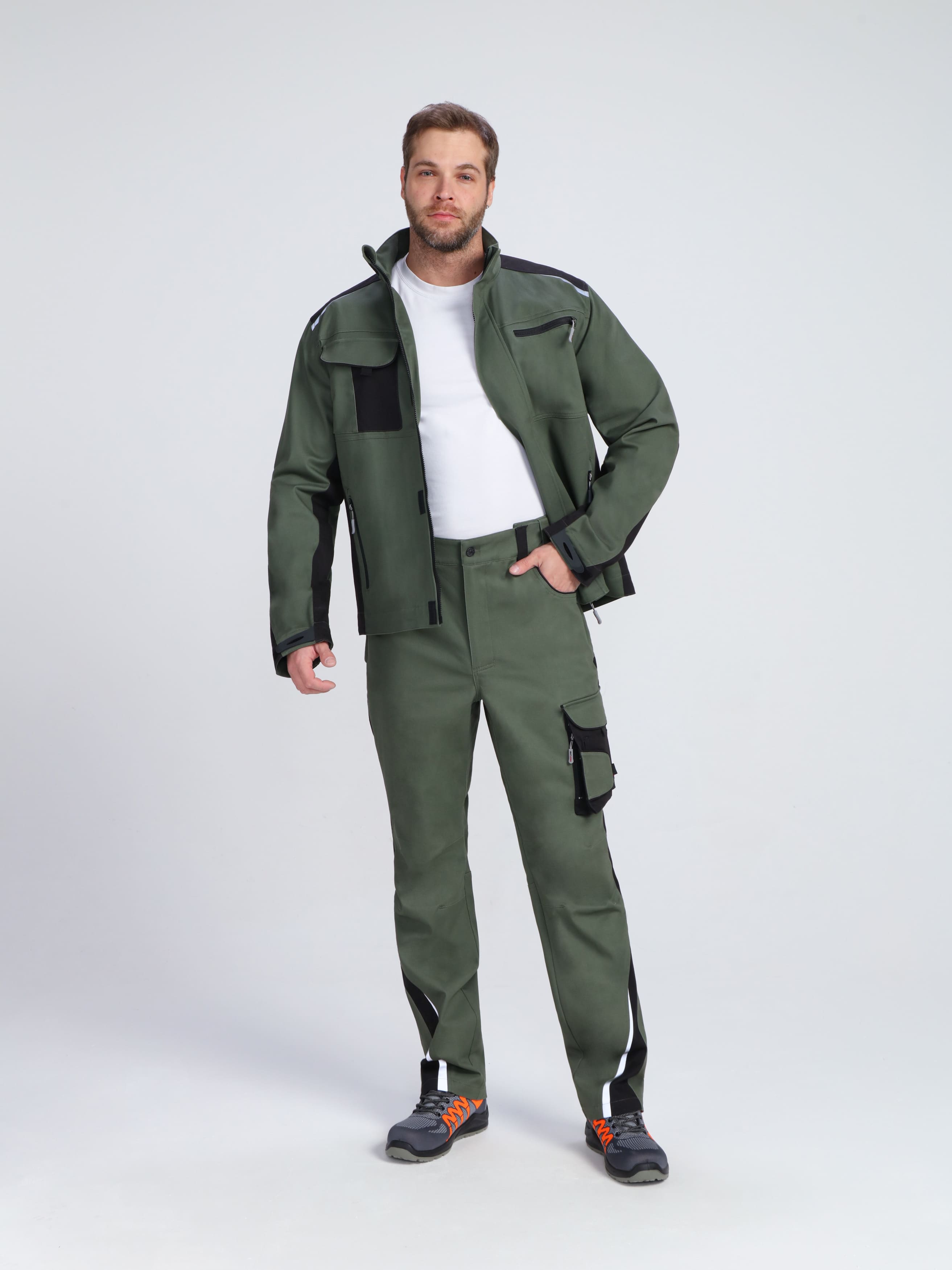 - Продуманная система карманов: 4 функциональных кармана, включая двухсекционный нагрудный с клапаном и петлей для бейджа, а также вертикальные прорезные с молнией для безопасного хранения