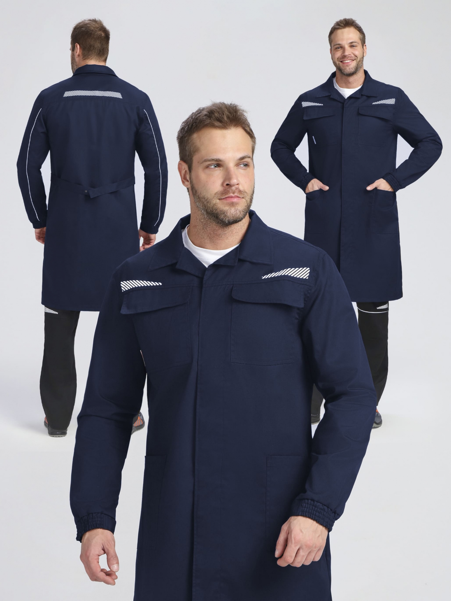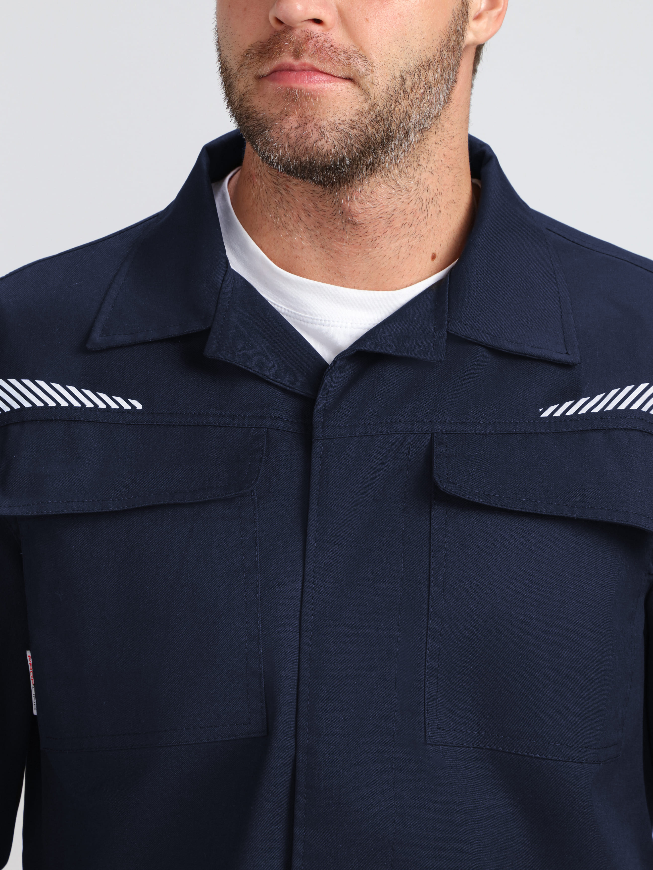 - Светоотражающие элементы: сегментированные термоленты на нагрудных кокетках и спинке, а также кант в локтевых швах для безопасности в условиях недостаточной видимости