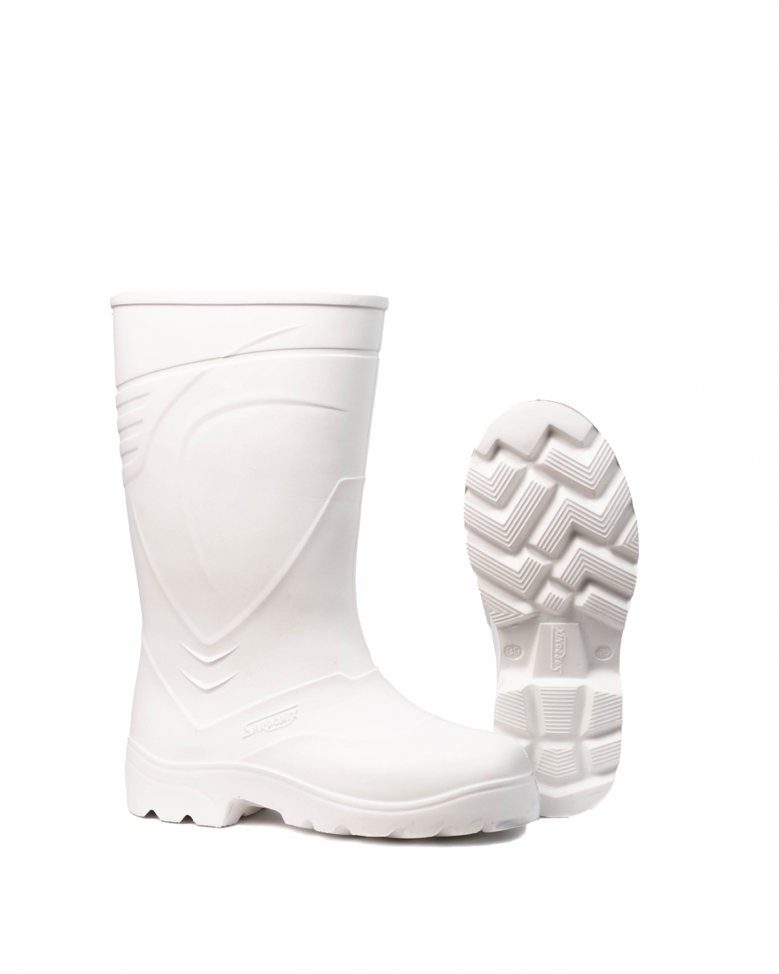 Сапоги мужские "Север" выполнены из современного материала ЭВА белые с защитным композитным подноском и стелькой. Обувь изготовлена методом однокомпонентного литья под давлением. Предназначена для применения в условиях агрессивных сред и пониженных температур, защиты ног от воды, Обладают легкостью (вес 1 пары 700 грамм). Предназначена для защиты от механических воздействий в носочной части до 200Дж, устойчива к проколу до 530Н. Обеспечивает противоскользящие свойства. Предназначена от общих производственных загрязнений, от кислот с концентрацией от 20 до 80%, от щелочей концентрацией от 20 до 50%, нефте-, масло-, жиростойкие.