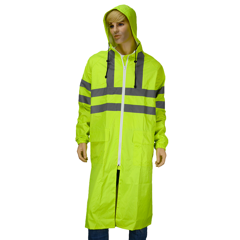 Изделие повышенной видимости 3-го класса, для защиты от воды 3-го класса. Плащ для защиты от воды с застежкой на тракторную двухзамковую молнию с ветрозащитной планкой, имеет капюшон, накладные карманы с влагозащитными клапанами, прошитые и герметично проклеенные швы, манжеты на рукавах. Объем капюшона регулируется по лицевому вырезу шнуром. Светоотражающие полосы шириной 50 мм.