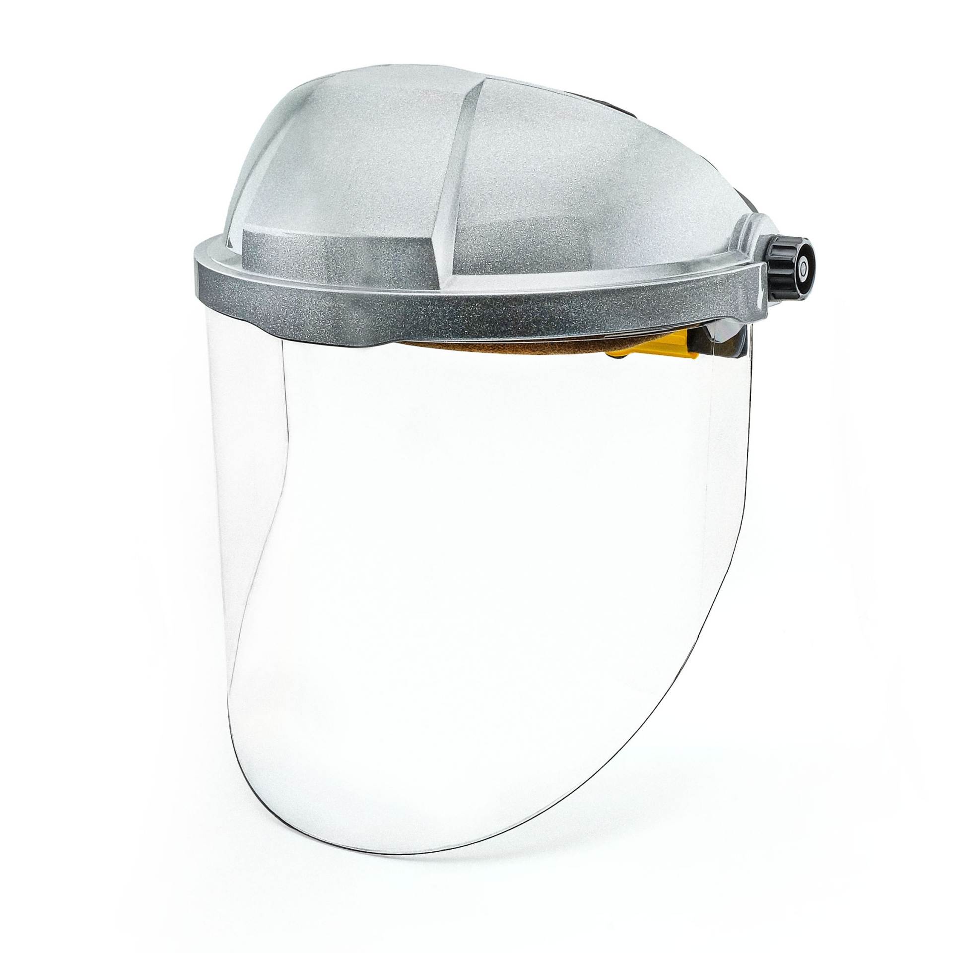 Для работ в различных отраслях промышленности, для защиты глаз и лица от искр и брызг неразъедающих жидкостей, от твердых частиц, абразивов, брызг расплавленных черных и цветных металлов, от высоких температур. Непрогораемый серебристый козырек из материала SUPER Termotrek. Экран из ударопрочного и термостойкого поликарбоната, защита от высокоскоростных летящих частиц с высокоэнергетическим ударом (190 м/с). Наголовное крепление РАПИД с обтюратором из натуральной кожи.