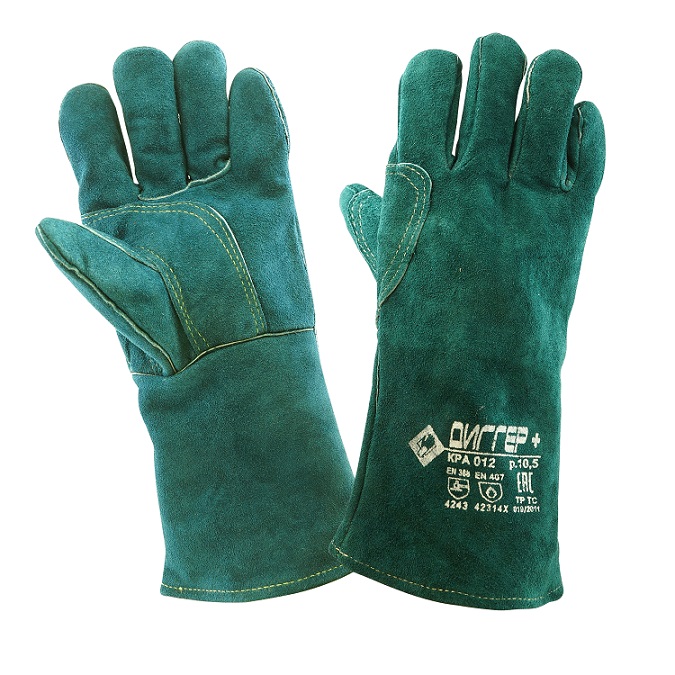 - краги ДИГГЕР+ из цельного спилка, пятипалые, с подкладкой из брезента и хлопка, длиной 350 мм (+10/-5мм)