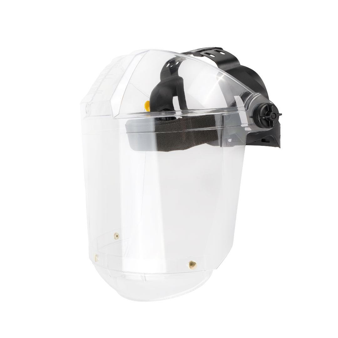 - увеличенный экран из твердого оптически прозрачного материала ударопрочный и термостойкий поликарбонат – защита от высокоскоростных летящих частиц с высокоэнергетическим ударом, имеет скошенную книзу форму для увеличения эргономики изделия, исключает неудобства при повороте и наклоне головы