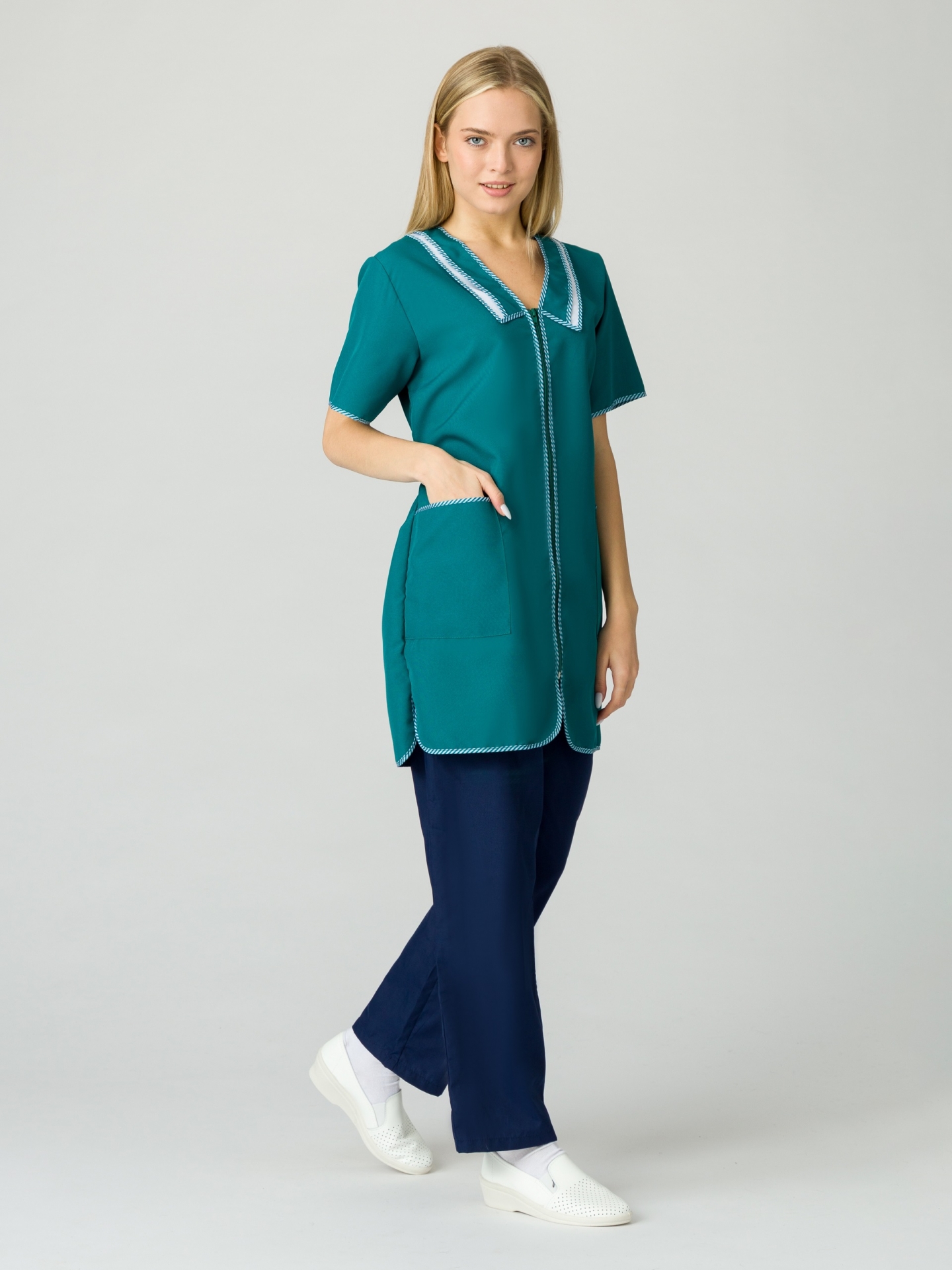 Халат рабочий женский «Сакура» отличается качественным исполнением и эстетичным внешним видом. Халат изготовлен в соответствии с ГОСТ, надежно защищает от общих производственных загрязнений и механических воздействий. Плотная ткань халата устойчива к многократным стиркам, сохраняет форму и цвет. Рабочая одежда дополняется вшивным поясом на завязках, который подчеркивает и регулирует линию талии. Короткий женский халат длиной до колена отлично сидит по фигуре, не стесняет движения. Благодаря контрастному принту и двойному отложному воротничку модная спецодежда выглядит привлекательно и современно. Халат застегивается на молнию, предусматривает наличие вместительных боковых карманов для хранения нужных мелочей. Если Вы ищете халат рабочий большого размера, то также обратите внимание на данную модель, т.к. она учитывает все потребности женщин разной комплекции.