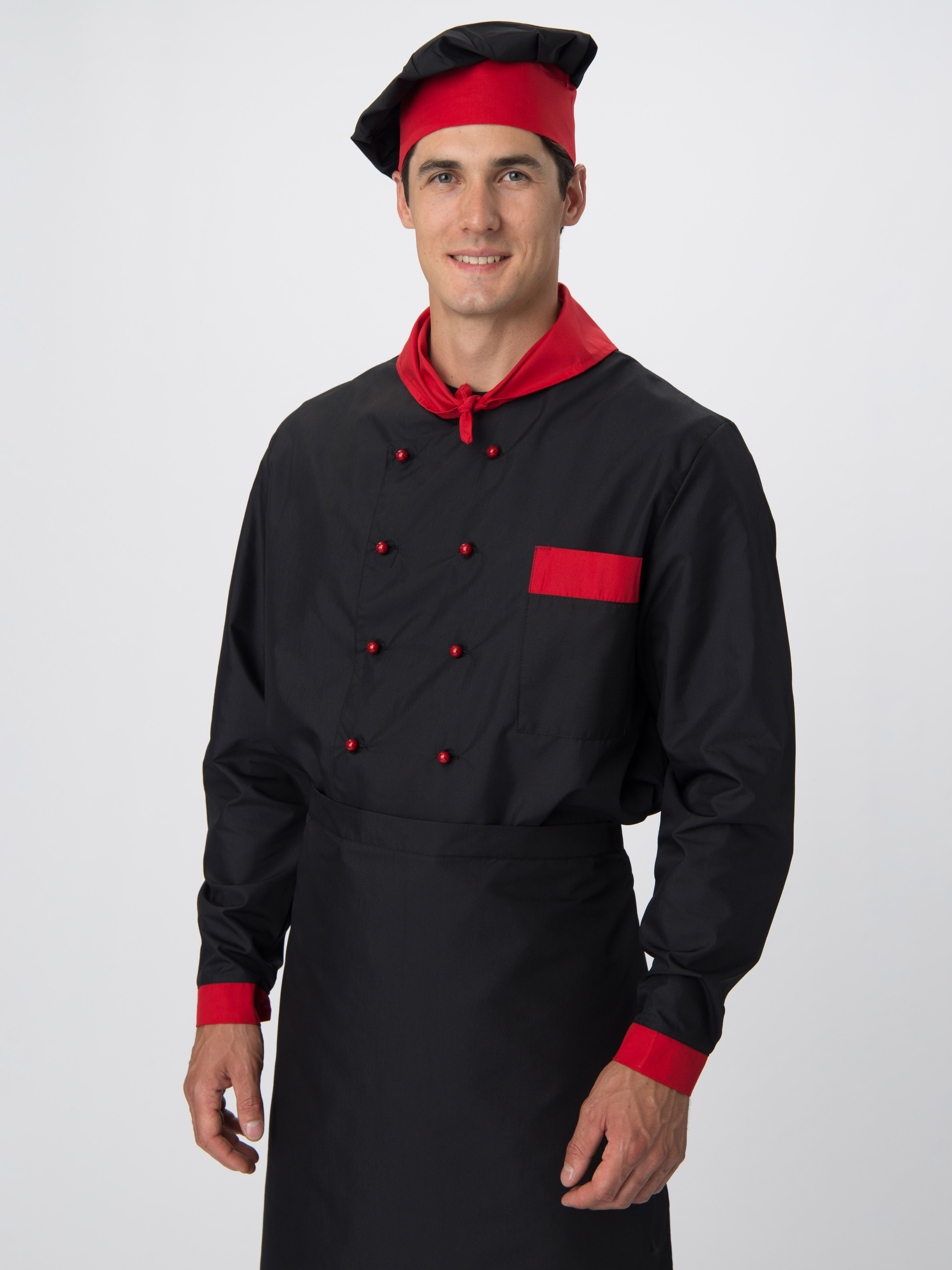 Костюм для повара «Шефирон» состоит из 5 предметов: китель повара, брюки, поварской колпак, фартук для повара, платок нашейный. Костюм поварской выполнен в стильном черном цвете с декоративной отделкой красными элементами. Плотная ткань с водоотталкивающей пропиткой обеспечивает костюму длительный срок службы, отлично отстирывается от загрязнений. Китель для повара с длинными рукавами оснащен двубортной застежкой на пукли и воротником с U-образным вырезом. Нагрудный карман подходит для хранения записей. Прямые брюки с поясом на резинке отлично сидят по фигуре и идеально дополняют китель. Колпак повара универсален: высота тульи 10 см, общая высота – 28 см. Регулируется по объему головы с помощью завязок на затылке. Фартук поварской без грудки завязывается на талии. Треугольный платок на шею 34*68 см выступает стильным элементом рабочей одежды.