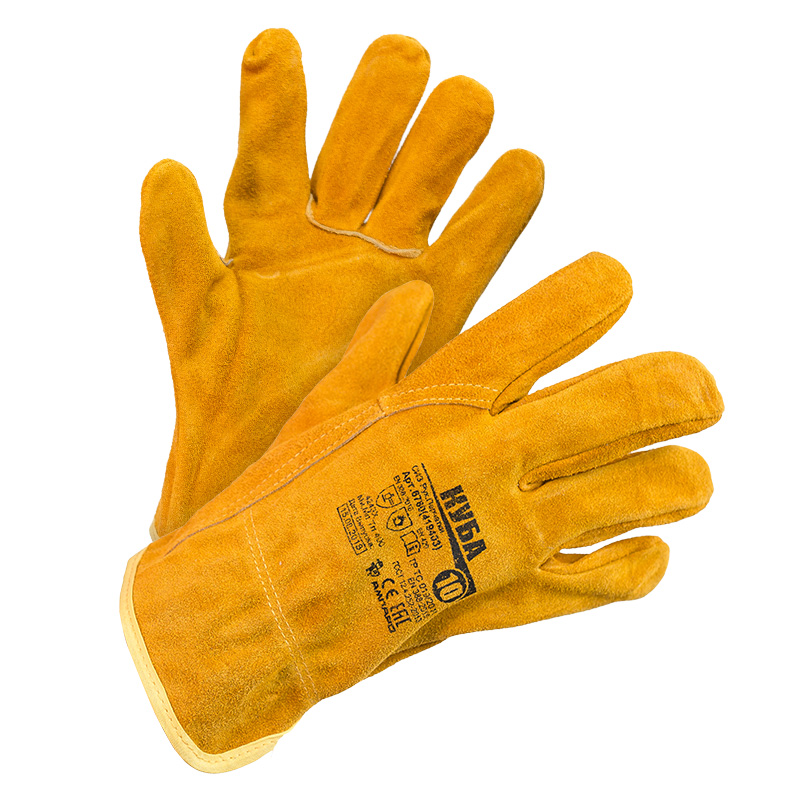 Мягкие комфортные перчатки из высококачественного кожевенного спилка для защиты рук от механических воздействий, общепроизводственных загрязнений и истирания. Перчатки спилковые повышенной прочности с манжетой-крагой, которая обработана по краю тесьмой. Защитные перчатки Куба предназначены для защиты рук от механических воздействий и общих производственных загрязнений. Изготовлены из окрашенного спилка КРС, толщиной не менее 1,1 мм. На тыльной стороне краги имеется эластичная резинка.Предназначены для ремонтных, сборочных, такелажно-погрузочных, строительных и монтажных работ, а также работ общего назначения. В том числе работа со стеклом, кирпичом, металлическим профилем, слоистым пластиком, керамическими изделиями. Перчатки обладают стойкостью к истиранию, порезу, проколу, стойкостью к контакту с нагретыми поверхностями до 350 С.