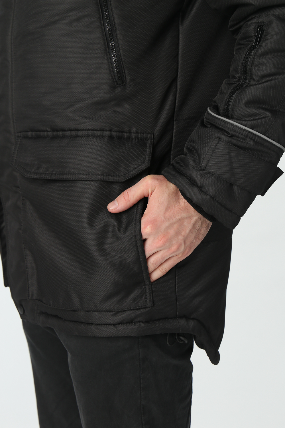 - на левом рукаве внизу расположен прорезной карман, закрывающиеся на тесьму «молния»
