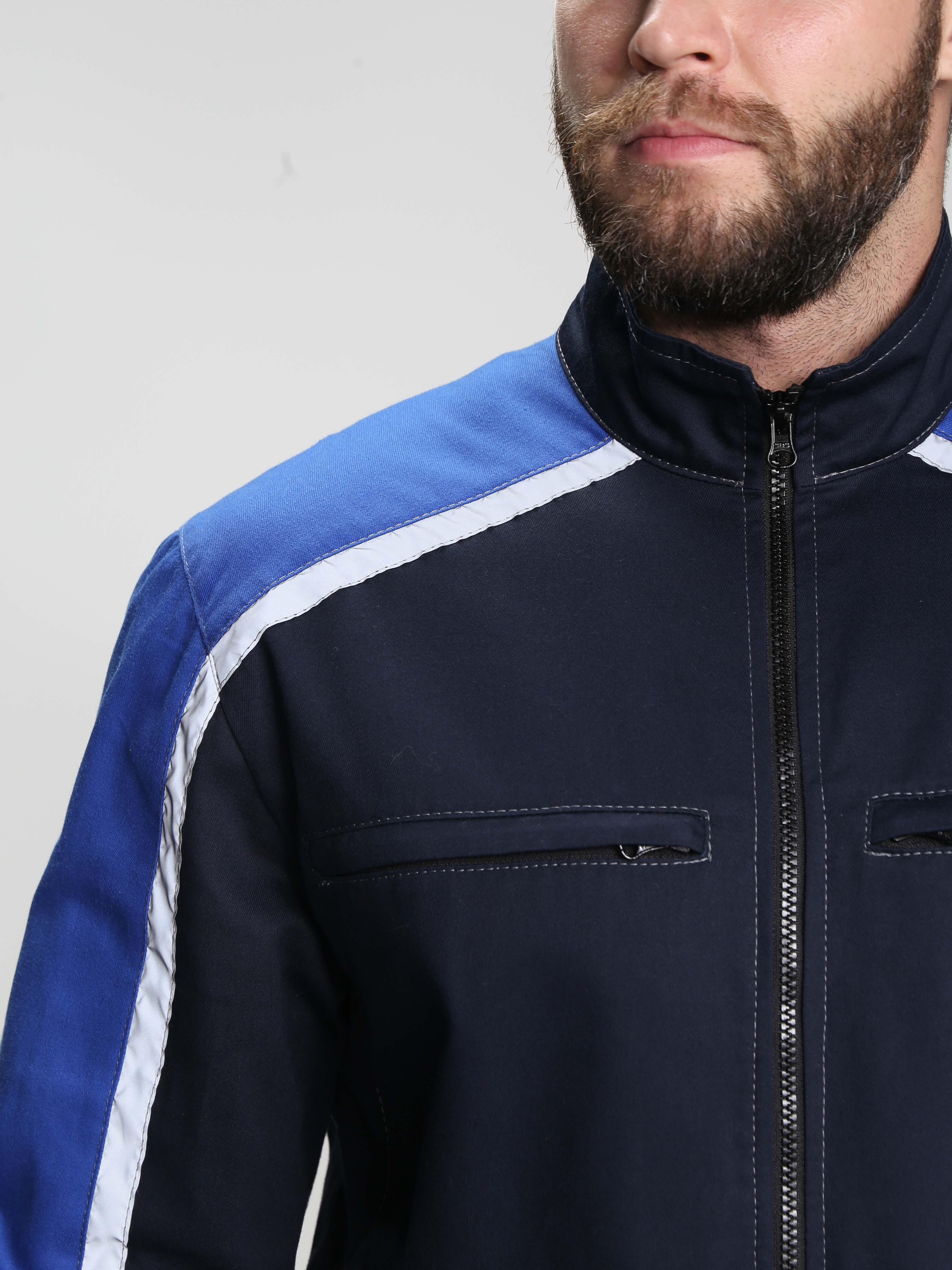 - Настроченные светоотражающие полосы (СОП) на кокетках полочек и спинки, а также на рукавах, повышают видимость и безопасность работника в условиях плохой освещённости.