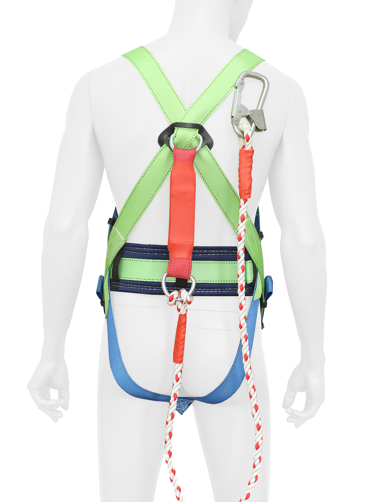 Страховочная система с наплечными и набедренными лямками со стропом из полиамидного каната в оплетке с амортизатором.