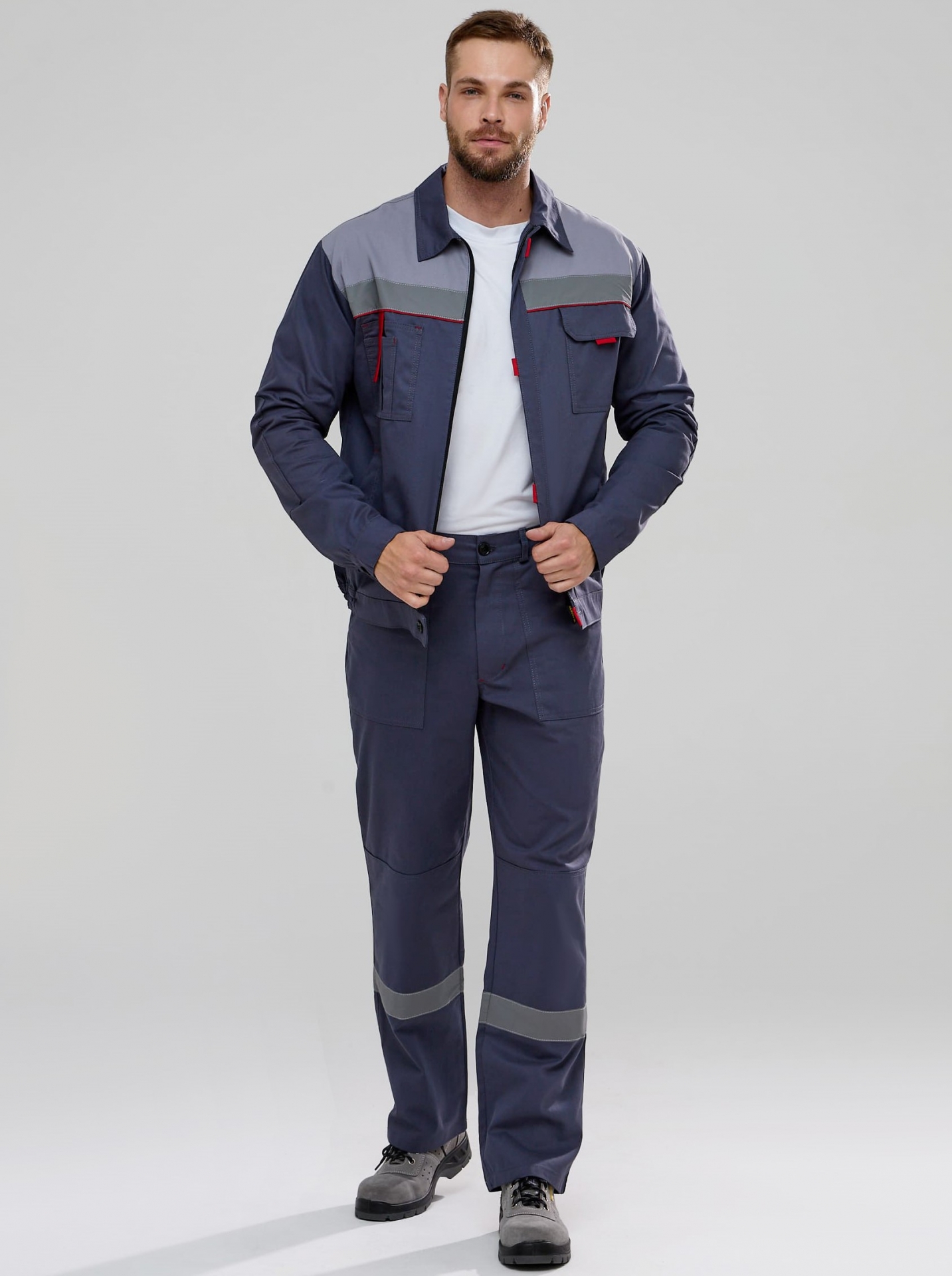 Костюм Флофт-1 СОП (тк.Саржа,250) брюки, т.серый/св.серый/красный