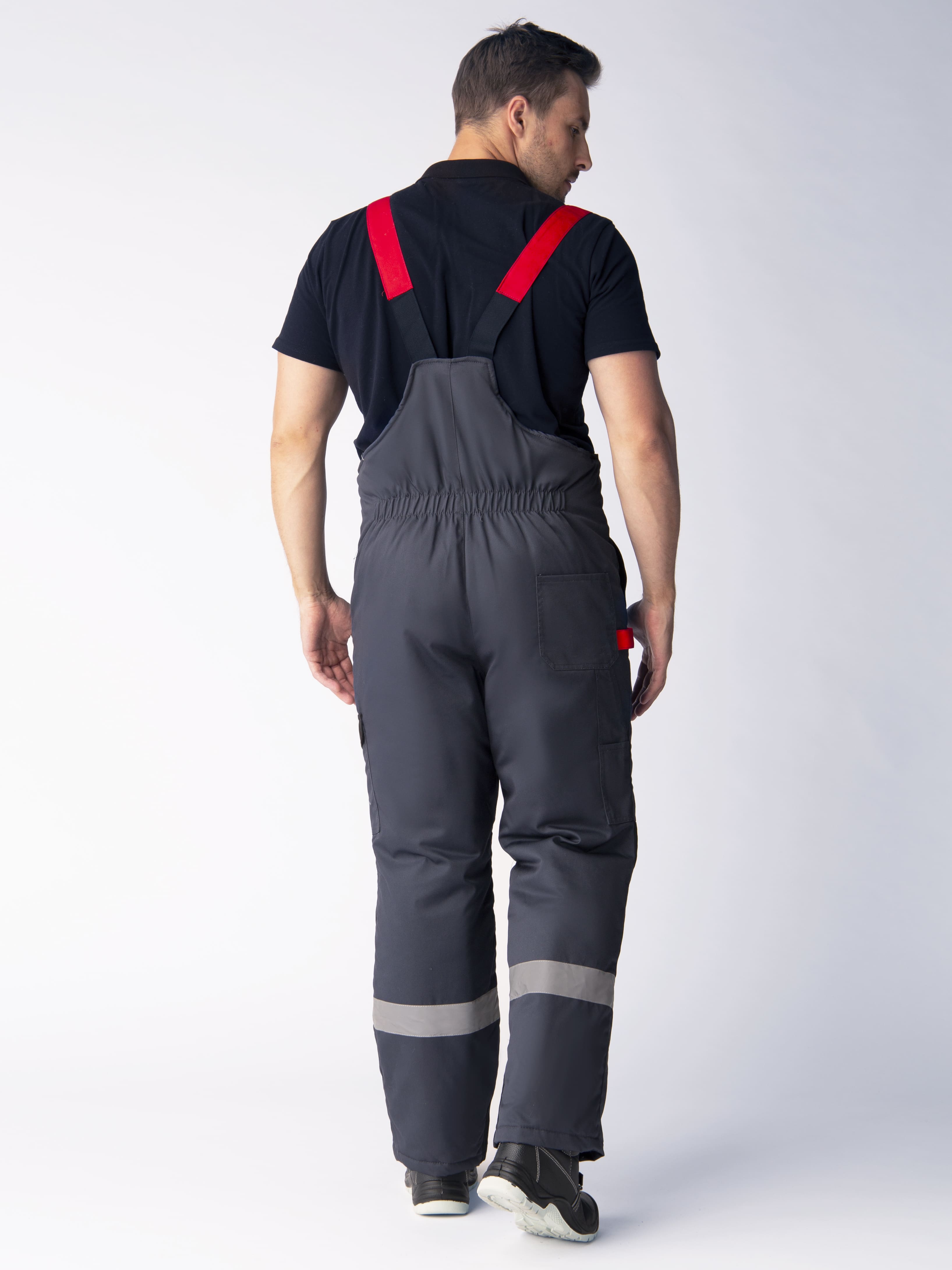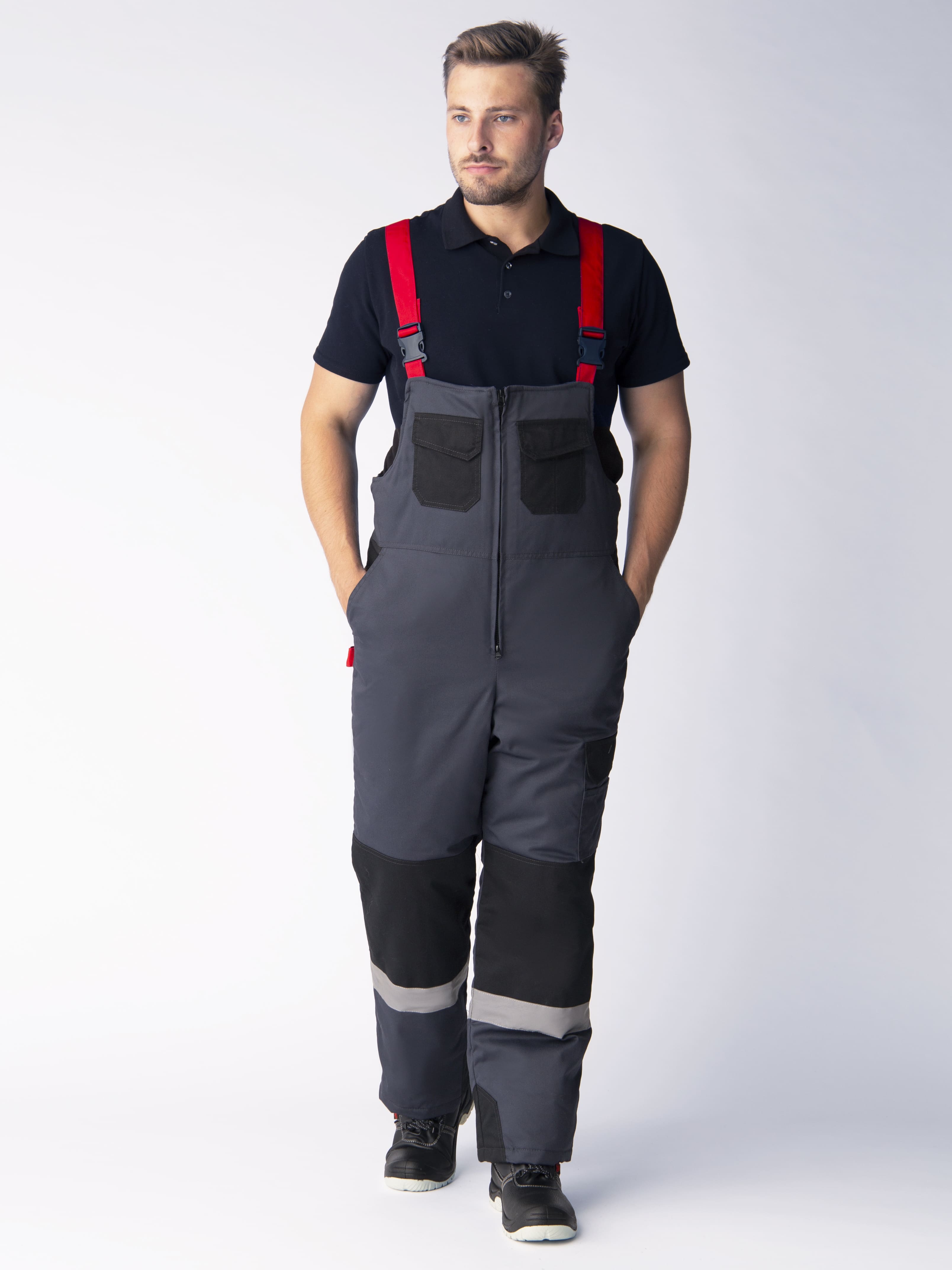 - Усилительные накладки в области колен из отделочной ткани и светоотражающие полосы (СОП 50 мм) в районе голеней