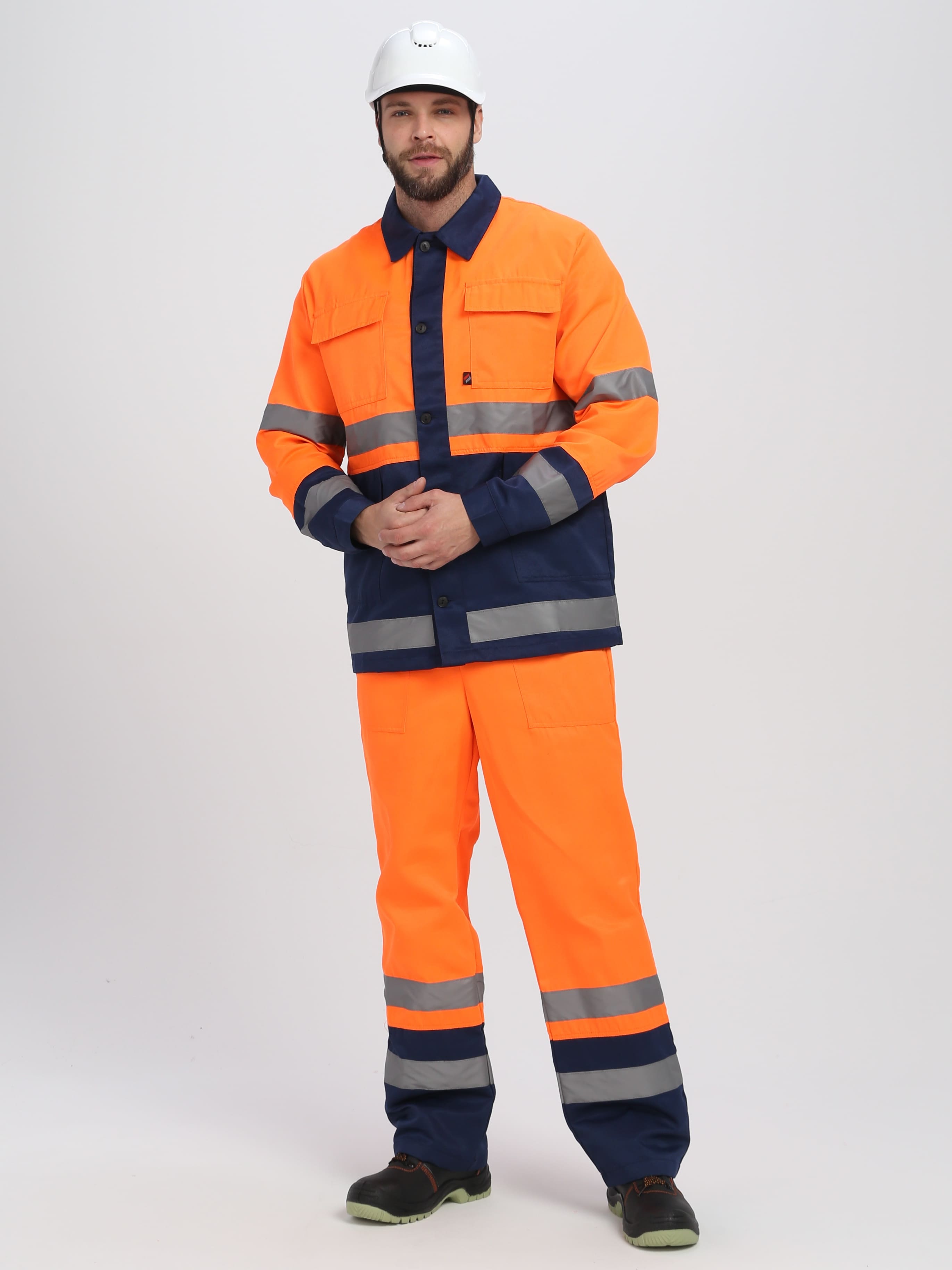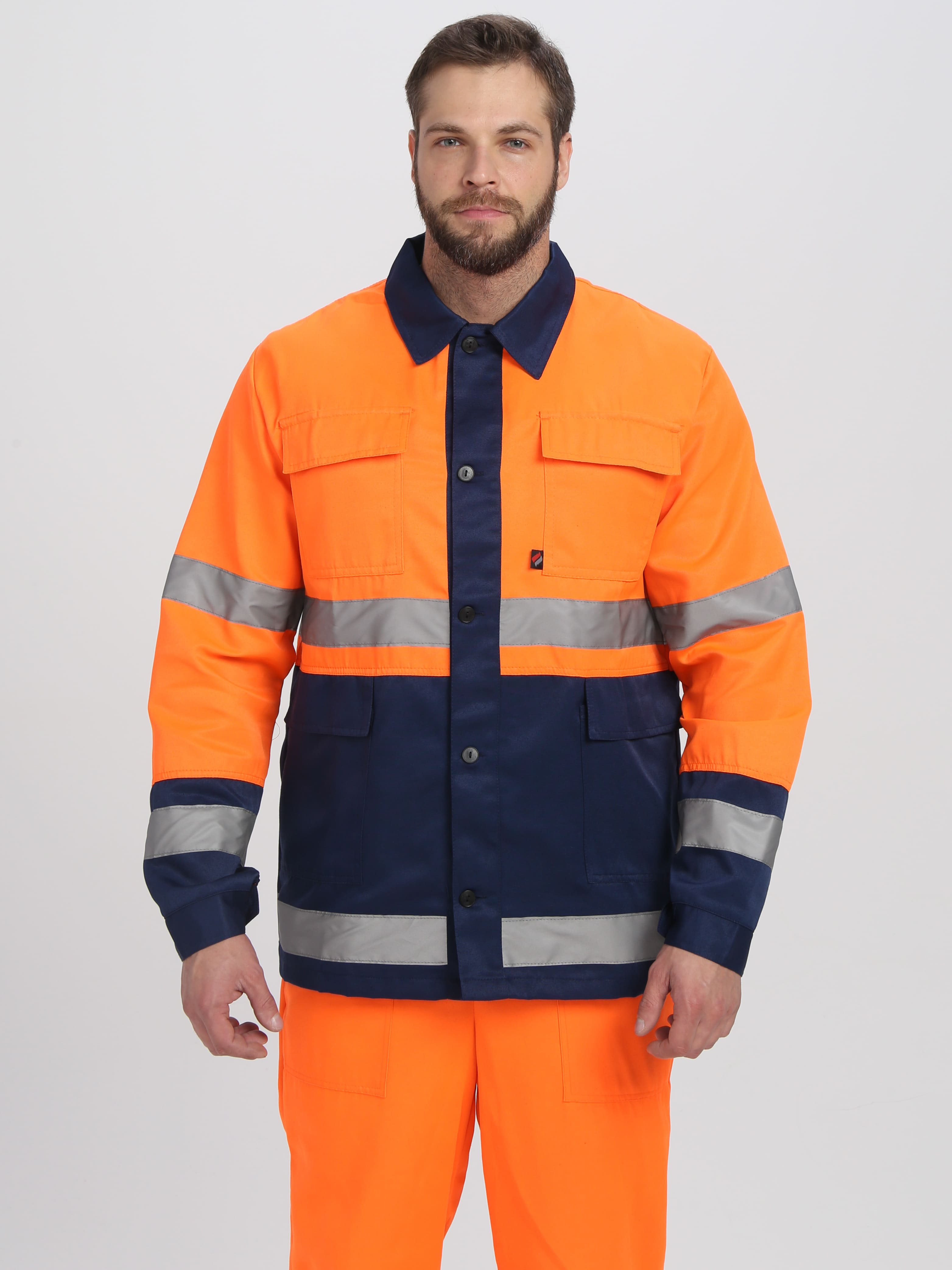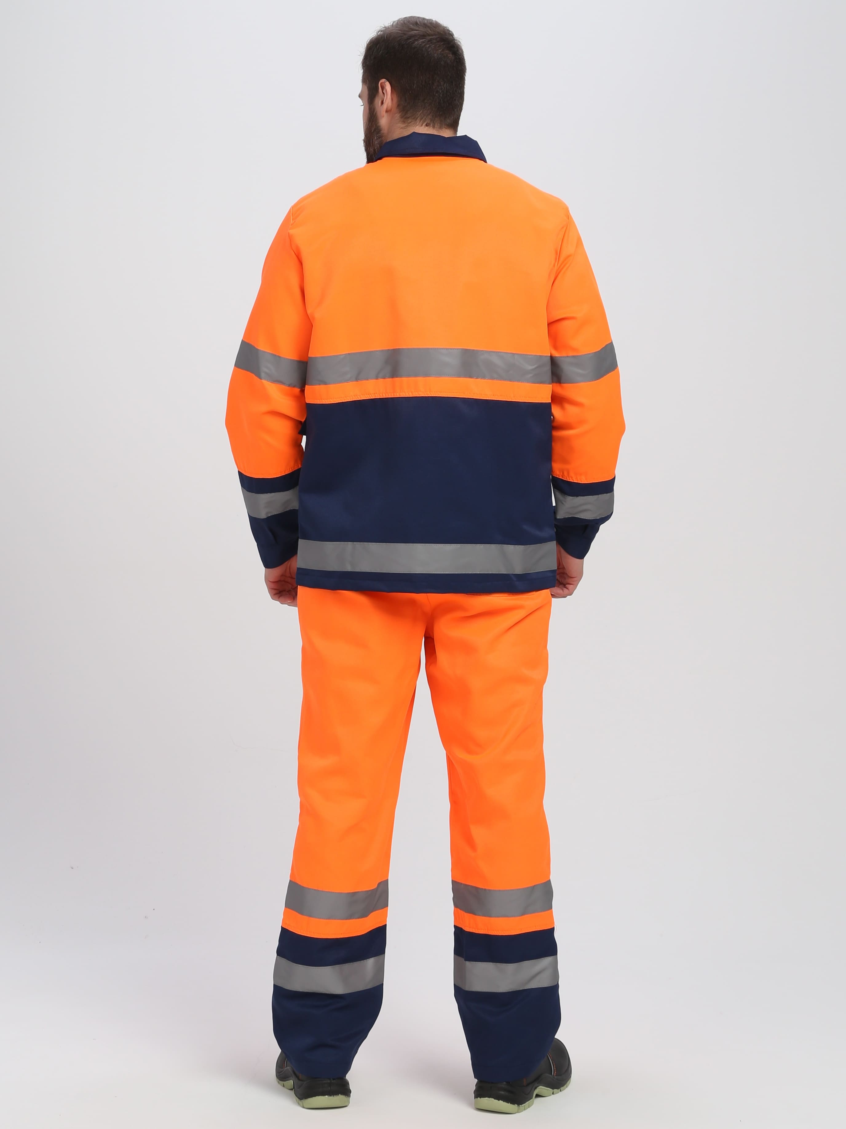 На куртке — широкие горизонтальные светоотражающие полосы: на рукавах и в районе торса. Фоновый цвет — темно-синий. Дополнительные вставки: ярко-оранжевые. На основе контраста оттенков костюм бросается в глаза и становится заметным издали.