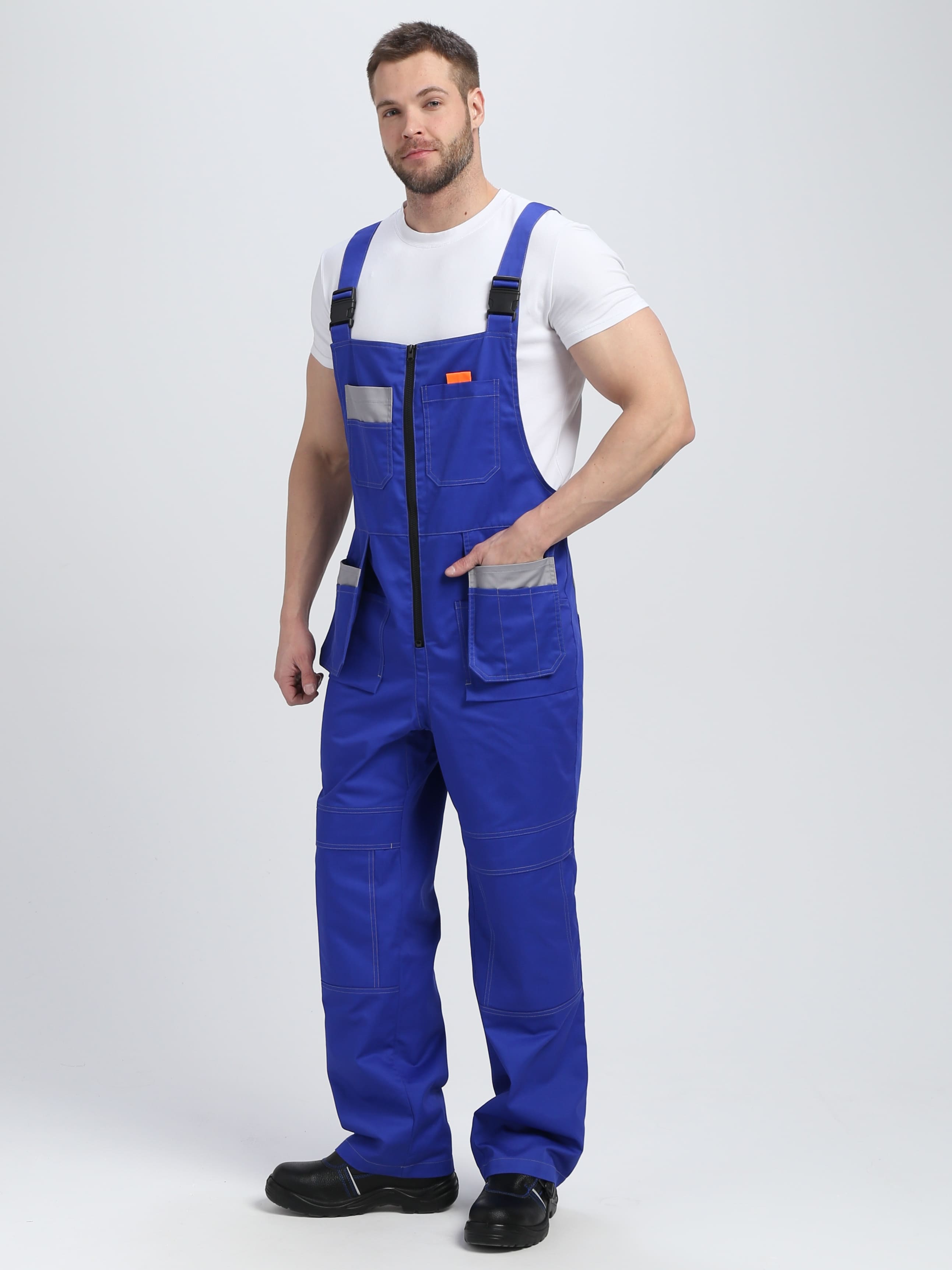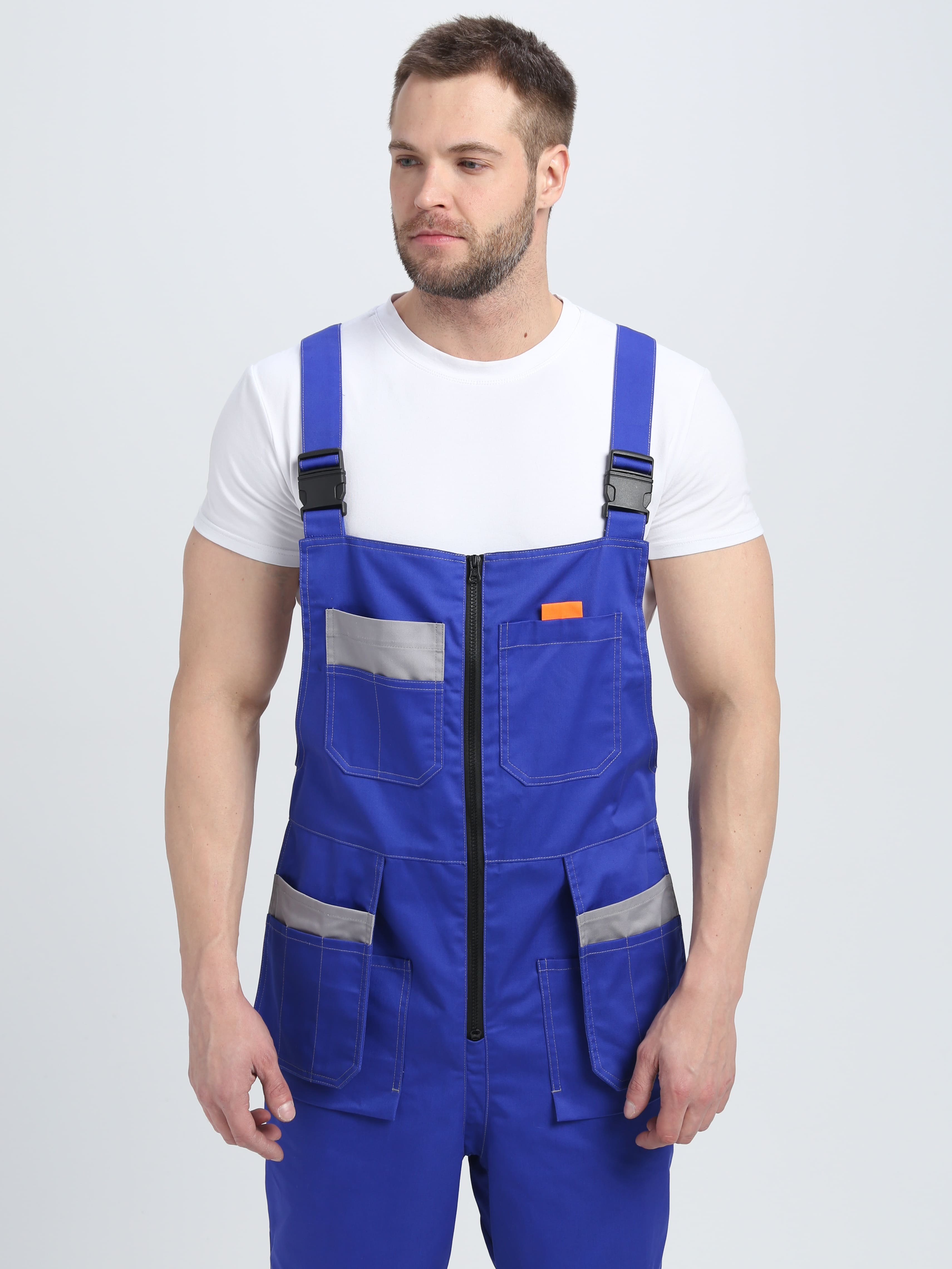 - на полукомбинезоне расположены 11 карманов разного размера и предназначения, в заднем кармане удобно хранить инструменты, а в передние с отлетным механизмом, можно сложить мелкие скобяные изделия, разделив их по сегментам