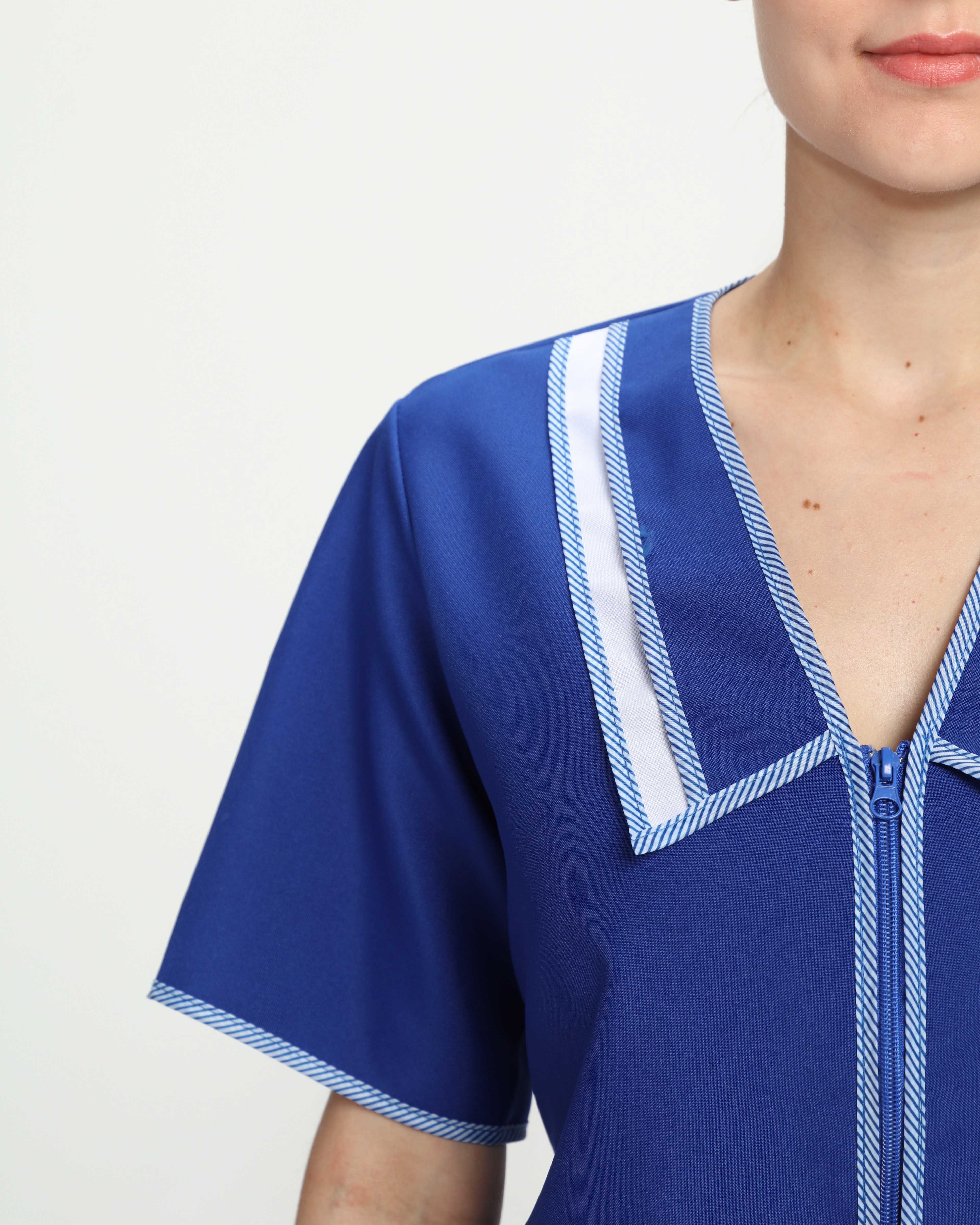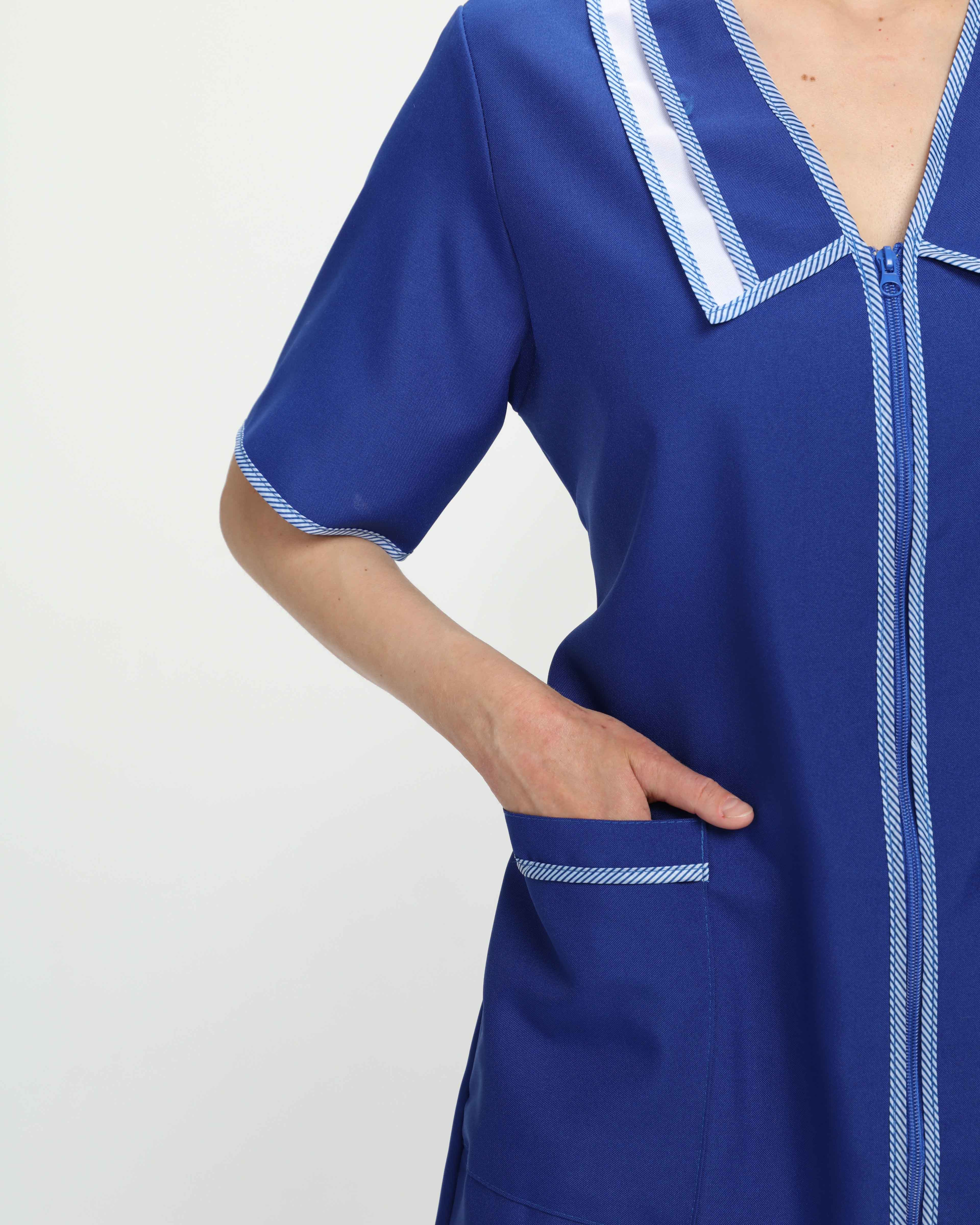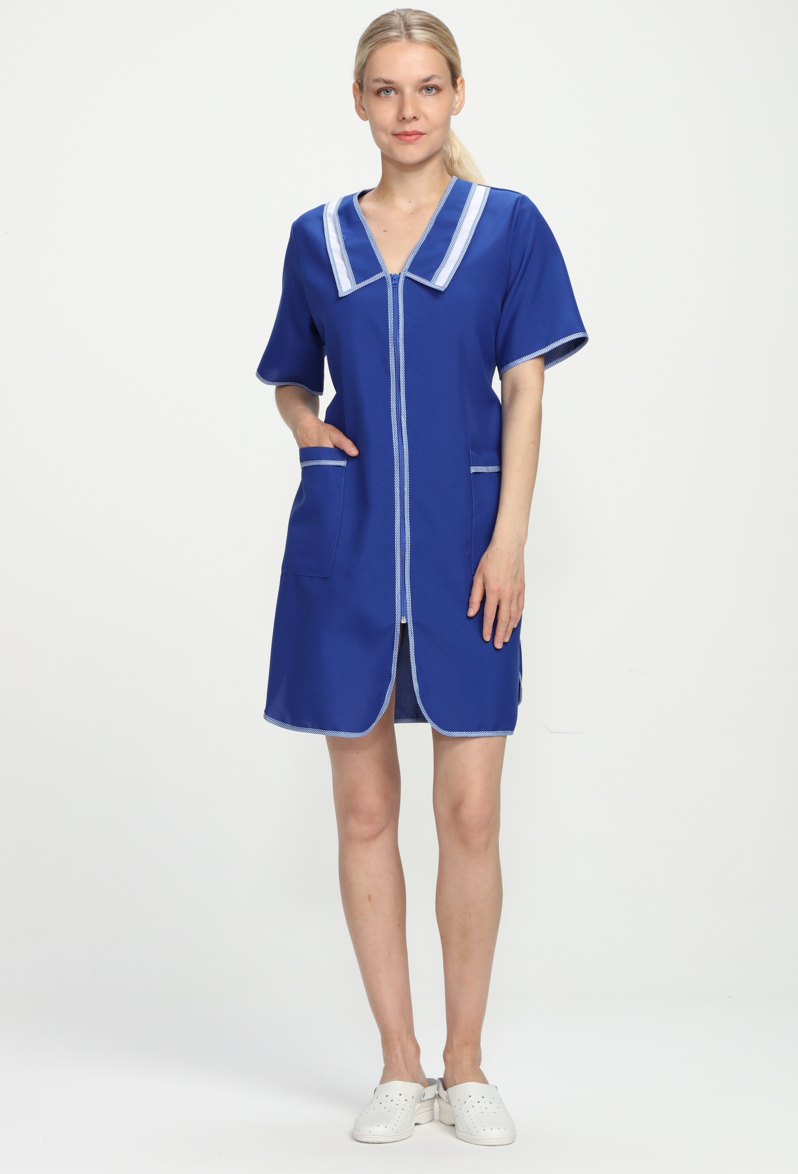 Халат рабочий женский «Сакура» отличается качественным исполнением и эстетичным внешним видом. Халат изготовлен в соответствии с ГОСТ, надежно защищает от общих производственных загрязнений и механических воздействий. Плотная ткань халата устойчива к многократным стиркам, сохраняет форму и цвет. Рабочая одежда дополняется вшивным поясом на завязках, который подчеркивает и регулирует линию талии. Короткий женский халат длиной до колена отлично сидит по фигуре, не стесняет движения. Благодаря контрастному принту и двойному отложному воротничку модная спецодежда выглядит привлекательно и современно. Халат застегивается на молнию, предусматривает наличие вместительных боковых карманов для хранения нужных мелочей. Если Вы ищете халат рабочий большого размера, то также обратите внимание на данную модель, т.к. она учитывает все потребности женщин разной комплекции.