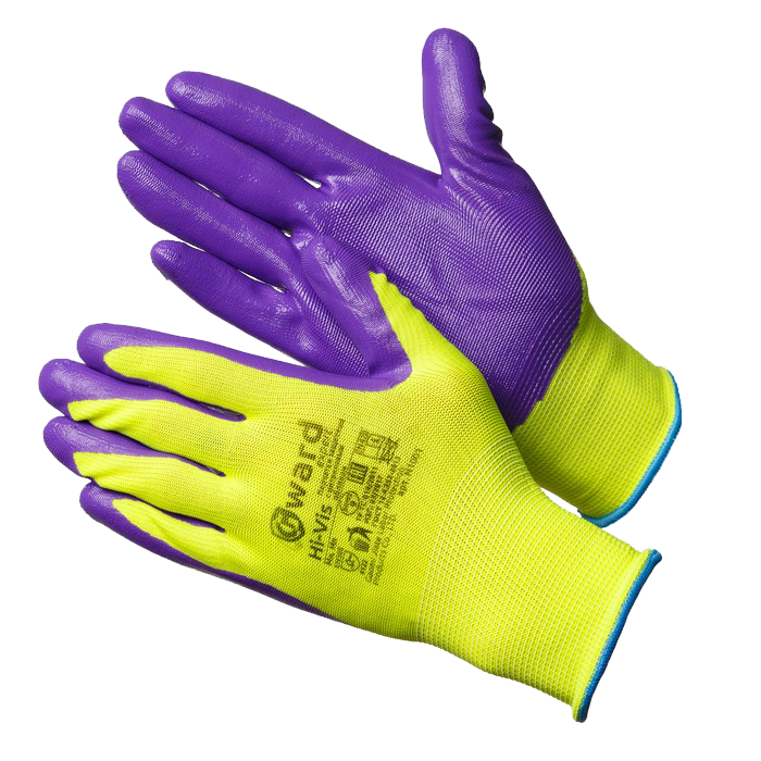 Нейлоновые перчатки цвета Hi-Vis, покрытые нитрилом фиолетового цвета. Бесшовная основа 13го класса вязки прекрасно вентилируется и не оставляет ворсинок. Универсальны, применяются для любых механических работ. Двойной оверлок с латексным кольцом обеспечивает превосходную фиксацию перчатки на запястье.