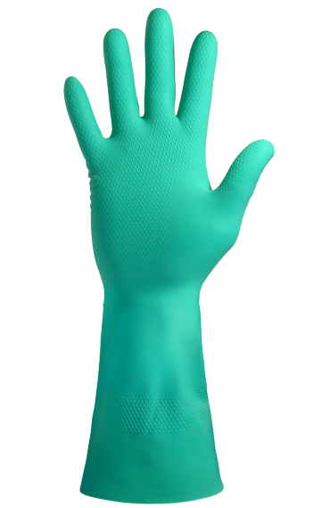 Многоразовые химостойкие перчатки из нитрила с внутренним хлопковым напылением и рифленой ладонной частью. Манжета раструб. Стойкость к химическому воздействию водных растворов кислот и щелочей средних и высоких концентраций, органических растворителей, продуктов нефтепереработки (масла, бензин, керосин) и других веществ на углеродной основе. Защита от общепроизводственных загрязнений. Сохраняют тактильную чувствительность рук. Комфортное хлопковое напыление внутри перчатки (может поставляться без внутреннего хлопкового напыления). Рифленая поверхность ладони обеспечивает хороший захват на сухих и промасленных поверхностях. Край манжеты может быть с адгезивной полосой (для лучшего сцепления с защитной одеждой), с прямым обрезом или с валиком (для предотвращения затекания жидкостей). По верху манжеты армирование (ребра жесткости) для исключения сползания манжеты. Водонепроницаемы. Анатомическая форма перчатки (повторяет форму руки).