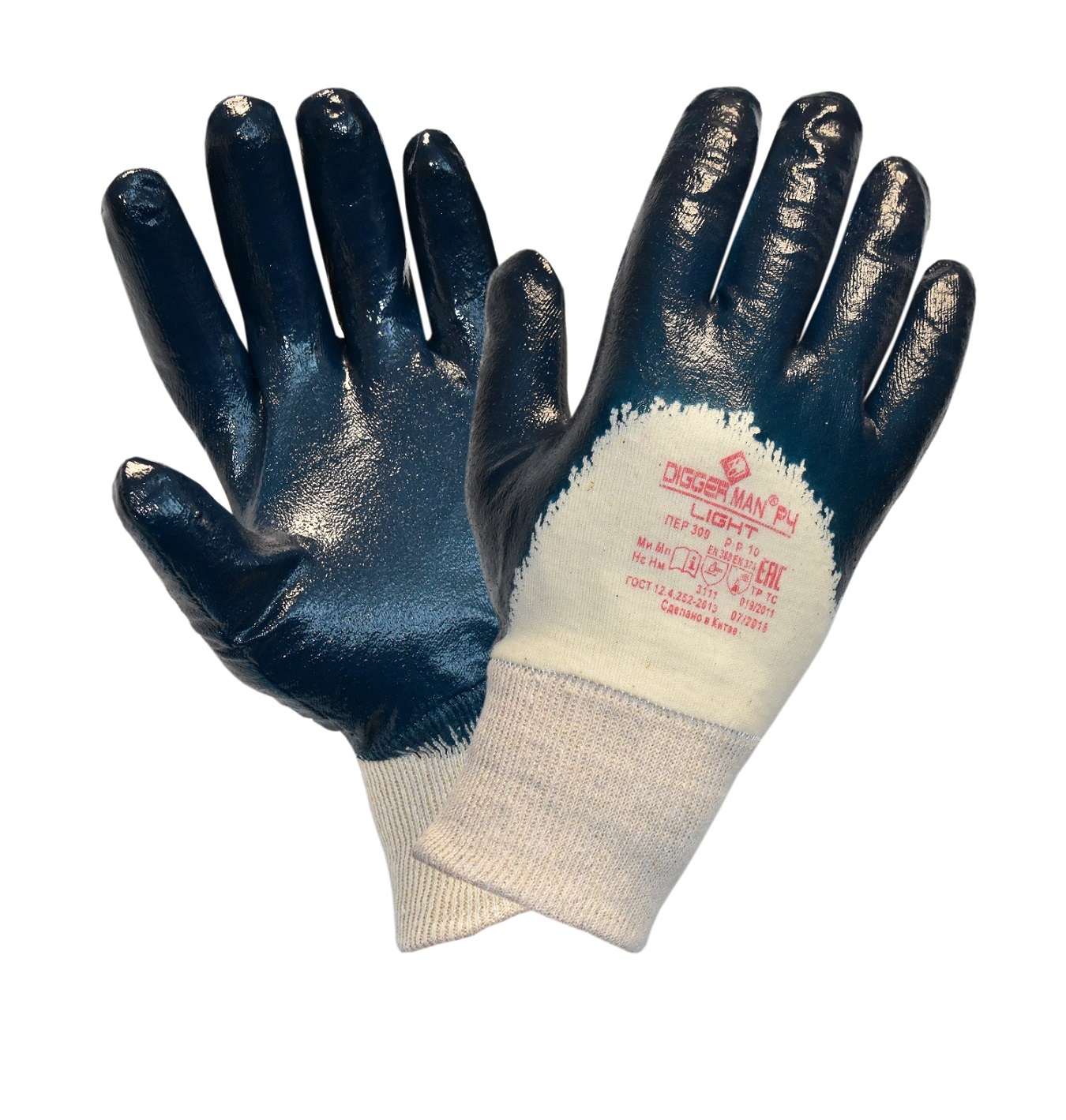 Перчатки нитриловые DIGGERMAN LIGHT РП облегченные – перчатки с легким нитриловым покрытием предназначены для защиты рук от механических воздействий (истирание, порез, прокол). 100% хлопковая основа interlock (интерлок) с частичным нитриловым покрытием, манжет — трикотажная резинка. Высокая чувствительность ладони и пальцев, ограниченная стойкость к агрессивным жидкостям, водостойкое покрытие. Высокое сопротивление истиранию, стойкость к разрыву, ограниченная стойкость к проколу и порезу. Рекомендованы для выполнения общих строительных работ, проведения погрузочно-разгрузочных работ.