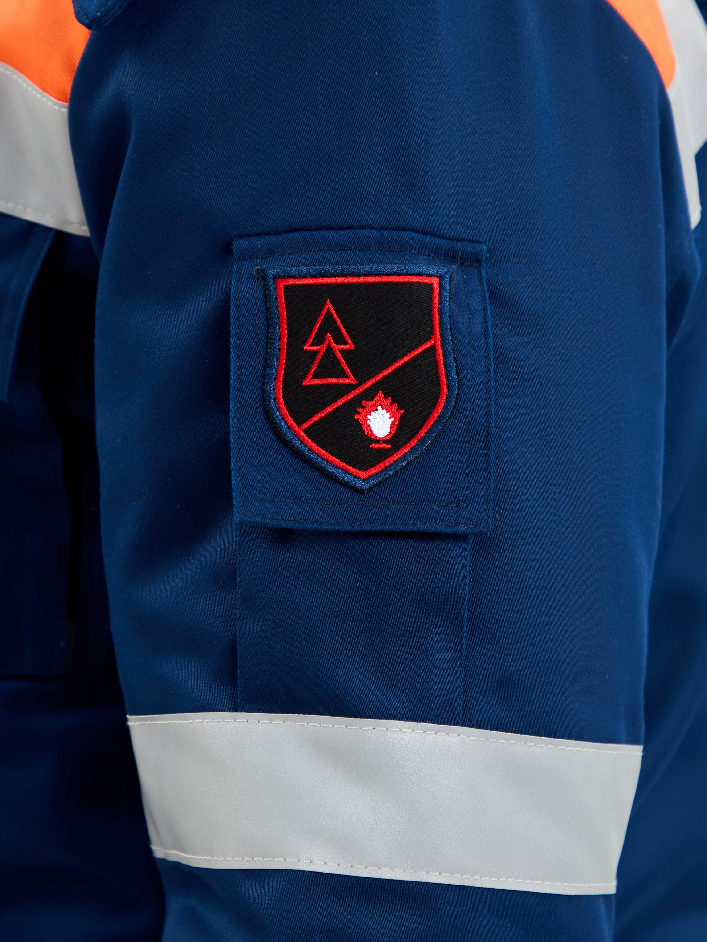 Костюм выполнен из термоогнестойкой, антистатической ткани Флеймтуфф (Flametuff) (88% х/б, 12% ПА, в т.ч. 2% антистатическая нить) плотностью 265 г/кв.м c НМВО, дополнительным слоем Флеймтуфф (Flametuff) (88% х/б, 12% ПА, в т.ч. 2% антистатическая нить ) плотностью 305 гр/кв.м (усилительные накладки) с НМВО, c термостойким утеплителем плотностью 150 г/кв.м и подкладкой плотностью 170 г/кв.м.
