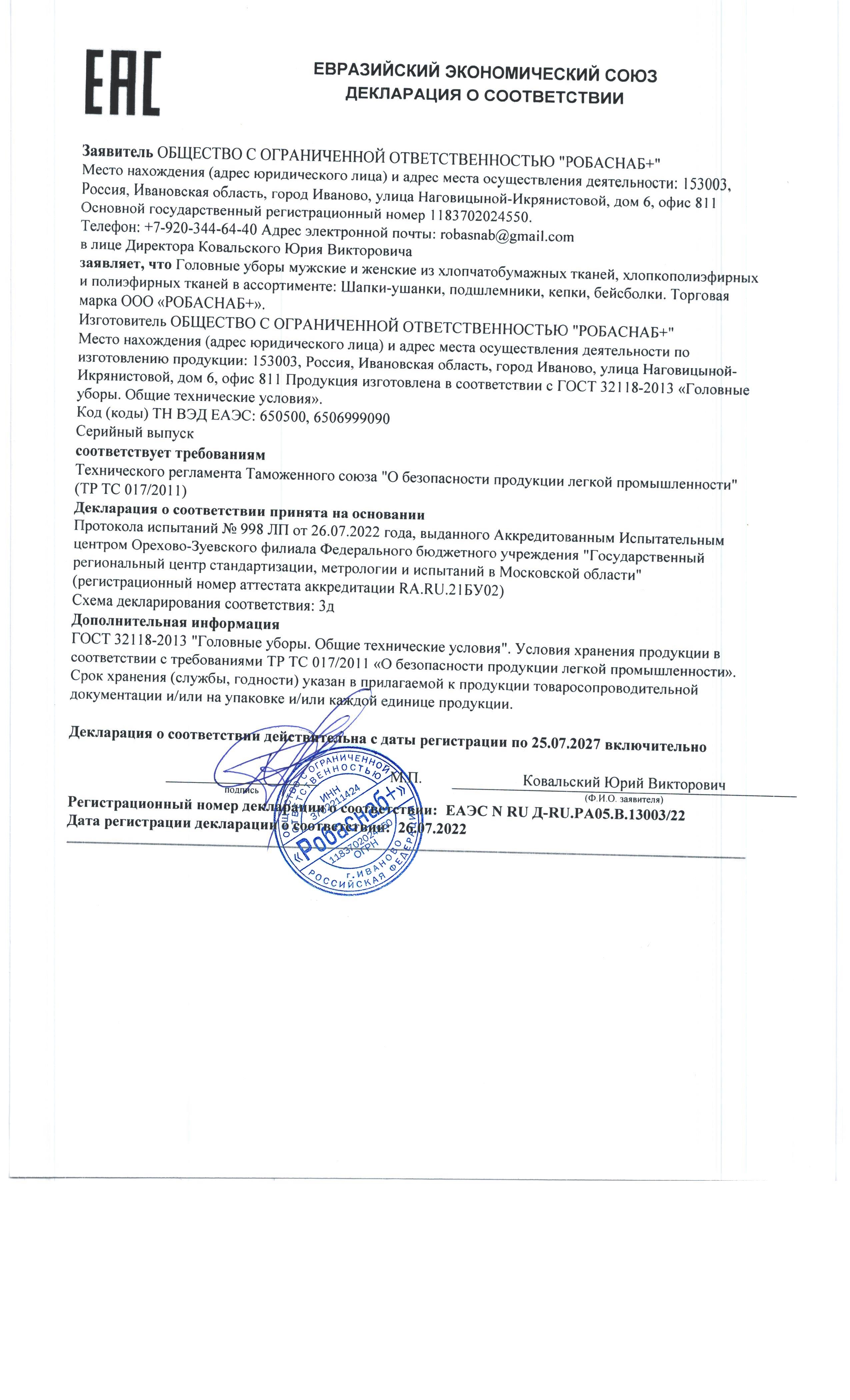 | ТР ТС: | 017/2011 |