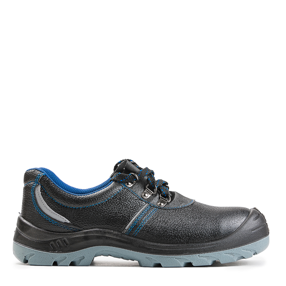 Полуботинки изготовлены методом литья промежуточного слоя подошвы из полиуретана к заготовке верха обуви. На промежуточный слой из полиуретана прилит ходовой слой из полиуретана высокой плотности с повышенными антискользящими свойствами. Имеется пристроченная прилитая задинка. Верх полуботинок из натуральной кожи. Подкладка полуботинок из текстильного материала, стойкого к истиранию и отводящего влагу от стопы. В верхней части выполнен мягкий кант. Полуботинки завязываются на шнурки и имеют глухой клапан. Шнуровка с использованием металлических люверсов. Стелька вкладная. В носочной части внутренний защитный подносок из композита. На боковинах выполнены фигурные световозвращающие элементы в виде полосок. Выполнена контрастная отстрочка синего цвета в тон цвета подкладки. Подошва двухслойная, оба слоя из полиуретана разной плотности, МБС. Есть внутренняя амортизирующая вставка в пяточной части подошвы. Глубина профиля ходового слоя подошвы составляет 3,5 мм. Цвет полуботинок черный.